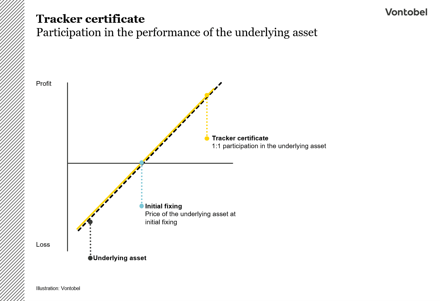 Tracker certificates are characterized by the fact that they replicate the performance of an underlying asset. Investors in the certificate participate 1:1 in the performance (rising and falling prices) of the underlying assets—allowing for any management or index fee if applicable. Investors in tracker certificates bet on rising prices of the underlying assets. If the price trend goes against them, that is, when prices fall, investors bear the risk of loss.