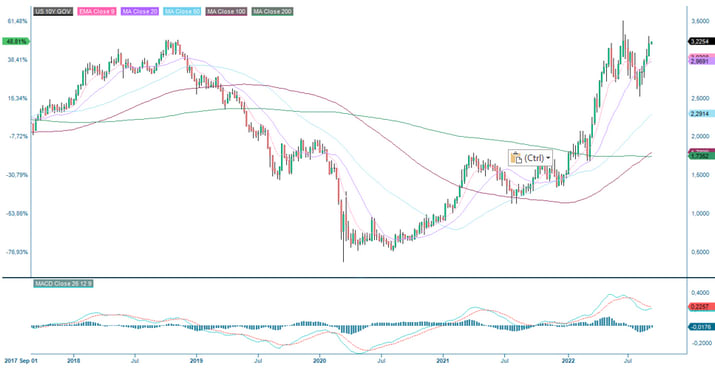 US 10-year Treasury Bond (in %), a weekly five-year price chart