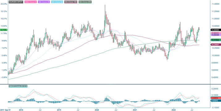 This time we choose a currency case, the EUR/SEK exchange rate. This is following the SEK not only weakening a lot against the USD but also against the EUR recently. Despite a very strong USD trend, we do not think it will be broken other than in the short term. This is due to continued turmoil in global equity markets (where the USD is a safe-haven currency). Furthermore, the USD exchange rate is driven by rising commodity demand (priced in USD).