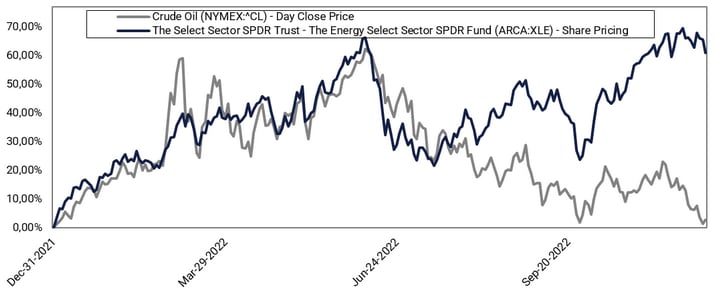 Crude Oil price (in USD) vs XLE Energy Sector ETF (USD)