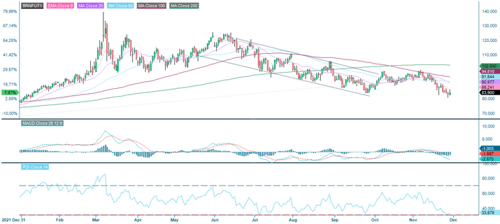 The oil price is in a negative trend but appears to be in a consolidation pattern and over-sold. However, there are no apparent signs of a bottom yet, and there might be further downside in the near term, e.g., continued hawkishness from the Fed (the next Federal Open Market Committee (FOMC) Policy meeting is on 13-14 December). Then again, policy signals from China could lead to a quick reversal. The prospect of another Chinese New Year in lockdown is undoubtedly not an enticing one, and the approaching holidays could press Xi to act.
