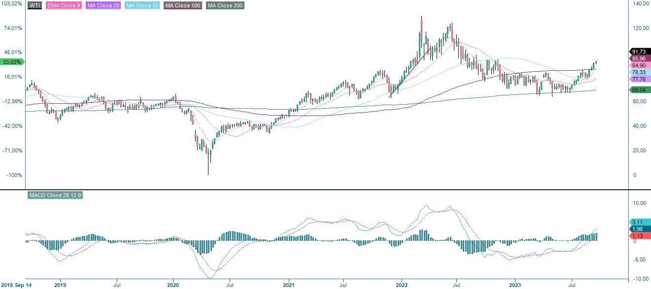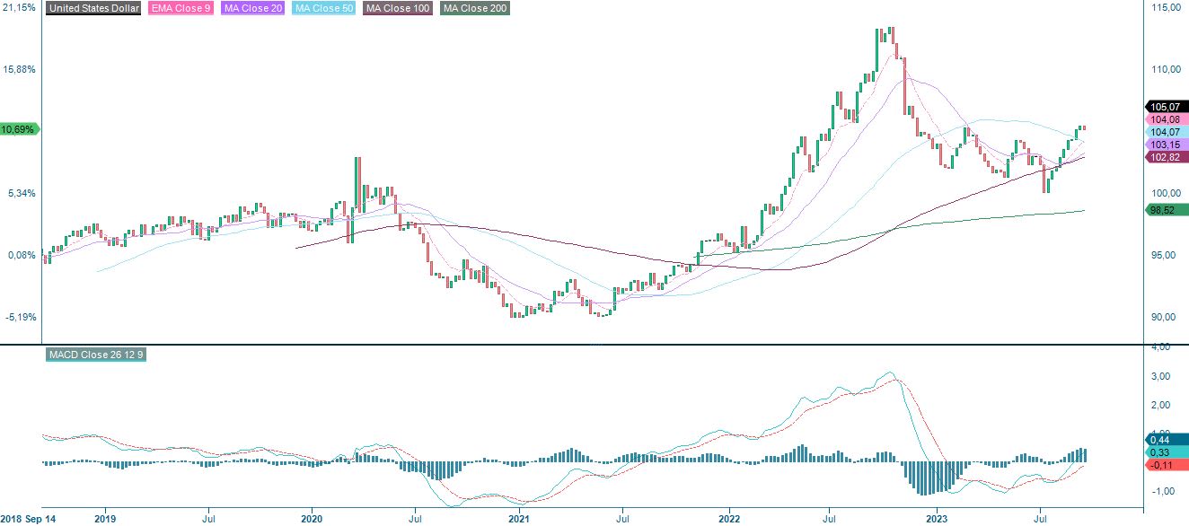 Higher oil prices are also supporting a stronger US dollar. A coordinated production cut by Saudi Arabia and Russia earlier this year has contributed to oil prices soaring above $90 per barrel for the first time since November 2022. Soaring oil prices have triggered inflation fears, boosting treasury yields and strengthening the US dollar. Further, the dollar will benefit more when energy costs rise since the United States is a net exporter of oil products.