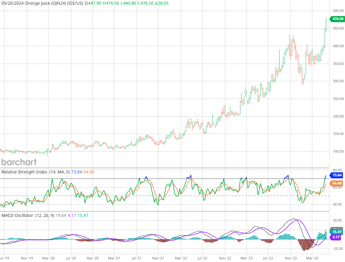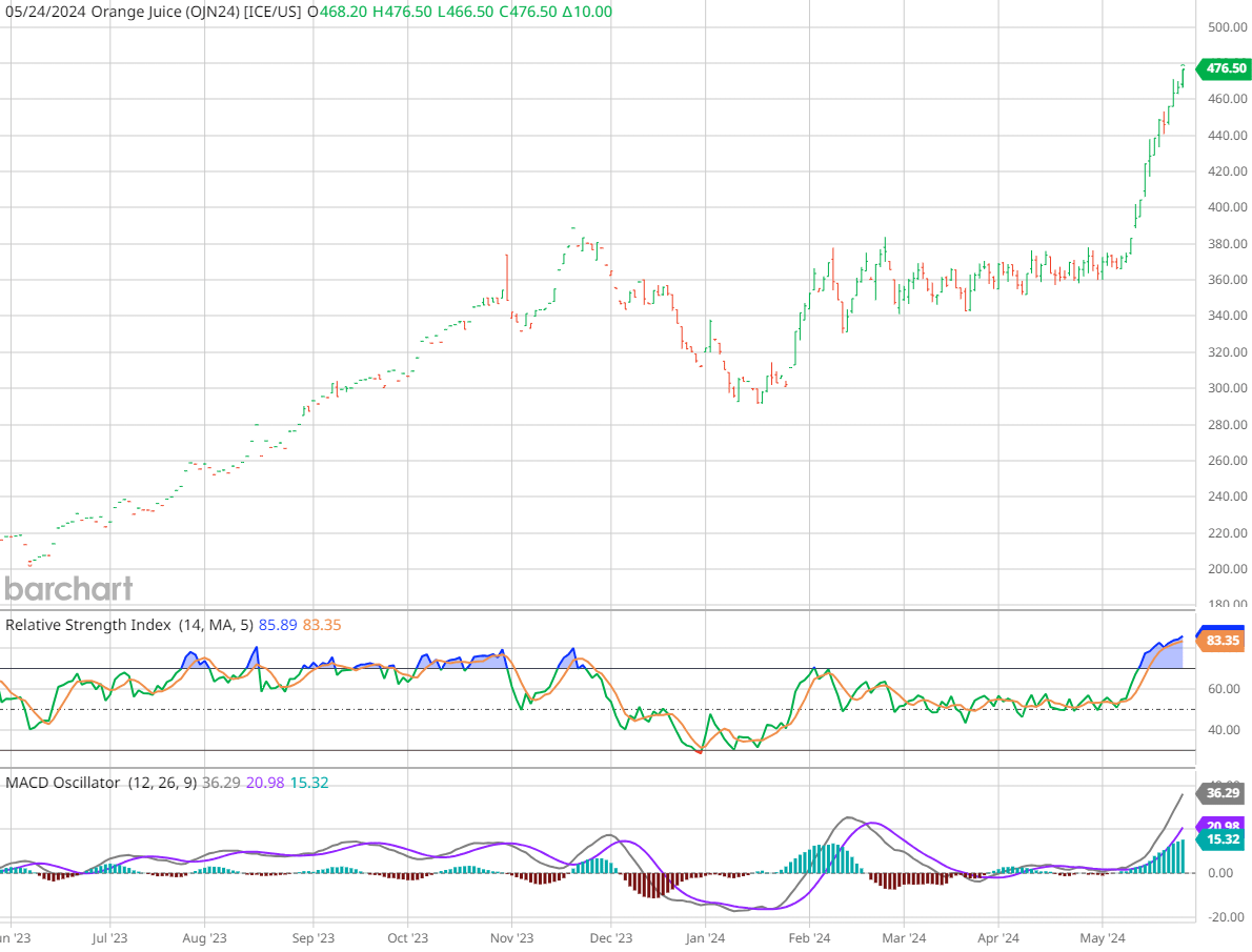 Since our last update on frozen concentrated orange juice (FCOJ) in early March, the prices of FCOJ futures prices have trended higher than expected. The lack of favourable weather and clinical progress against citrus greening disease has led to supply expectations drying up. However, as we approach the halfway point of 2024, bullish liquidity may dry up in the second half of the year.