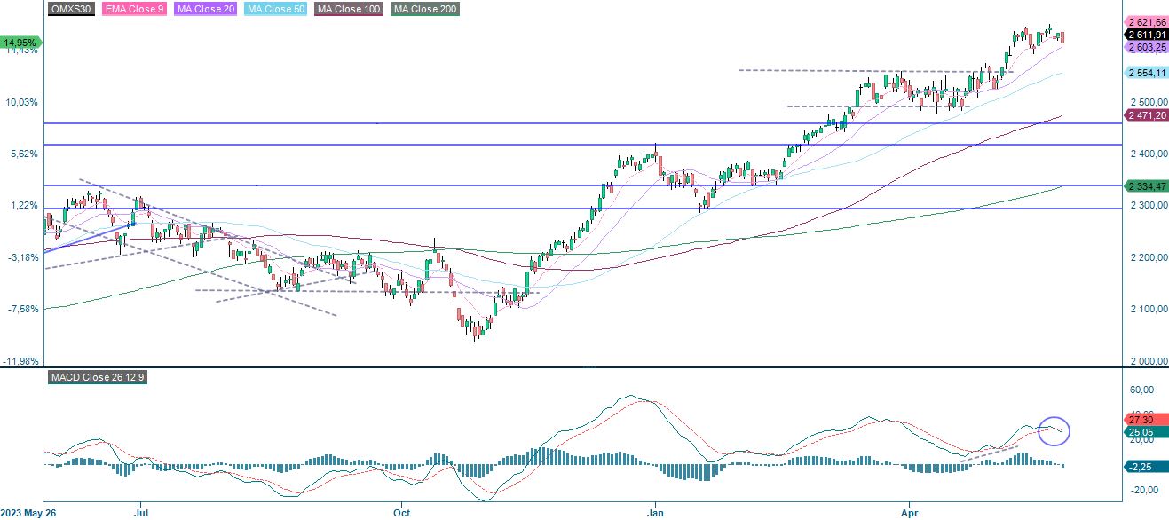 As the chart below shows, the Swedish OMXS30 is trading sideways. Meanwhile, the MACD has given a soft sell signal. Therefore, the risk is to the downside. The MA20 is acting as a support on the downside. The index needs a positive trigger to reduce the risk of a negative setback.