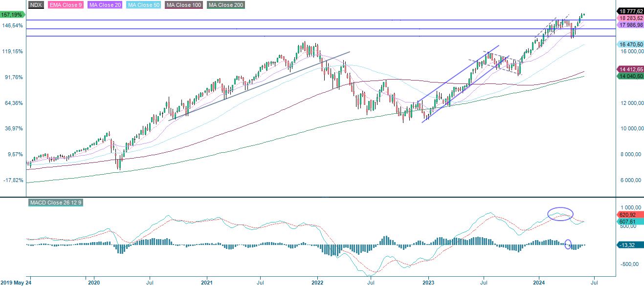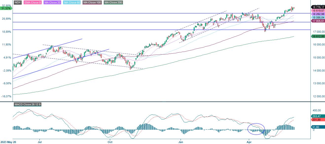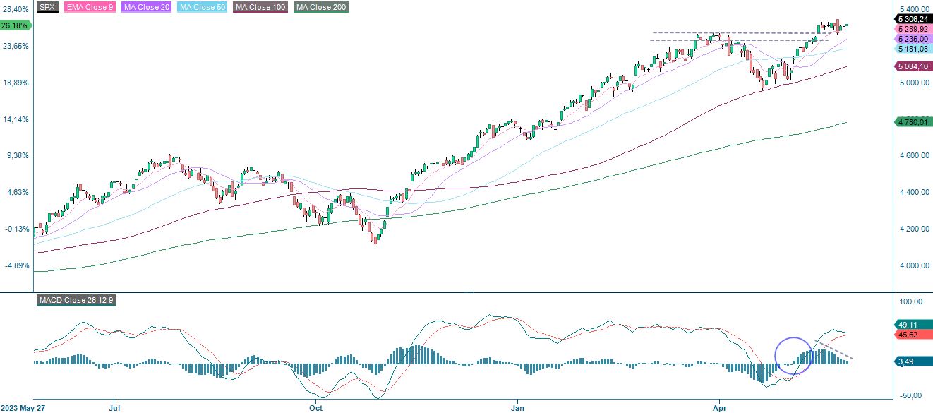 The S&P 500 is currently trading sideways with positive but declining momentum as shown on the MACD histogram. However, the index is well supported by a rising EMA9, support at 5,260 and a rising MA20. A potential trigger for the S&P's direction will be Friday's PCE figure from the US.