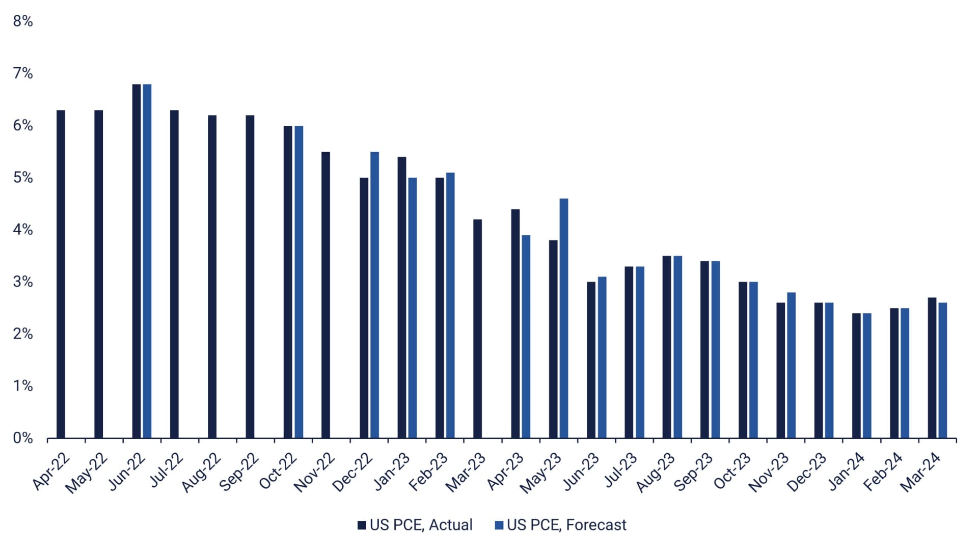 US PCE index, May 2022 to April 2024 (actual and forecast)