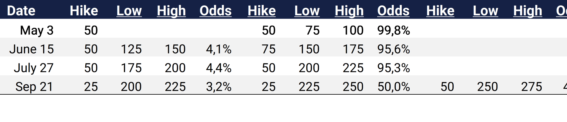 We have compiled investors' expectations of the Fed's rate hike trajectory in the table below and amounts in bps (save where there is %).