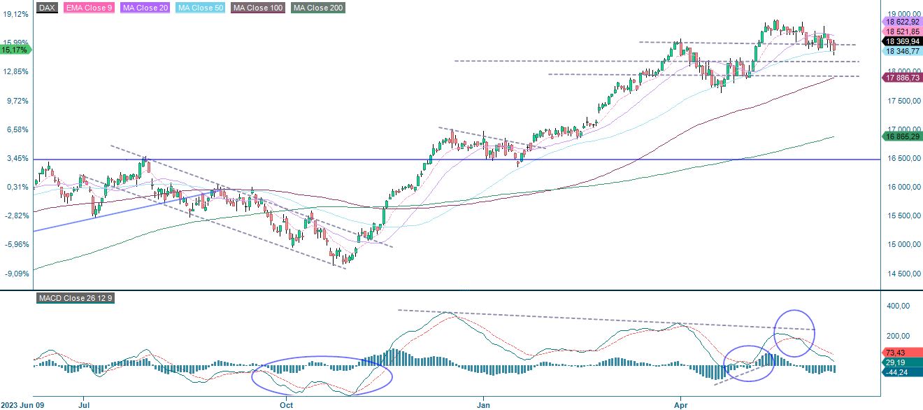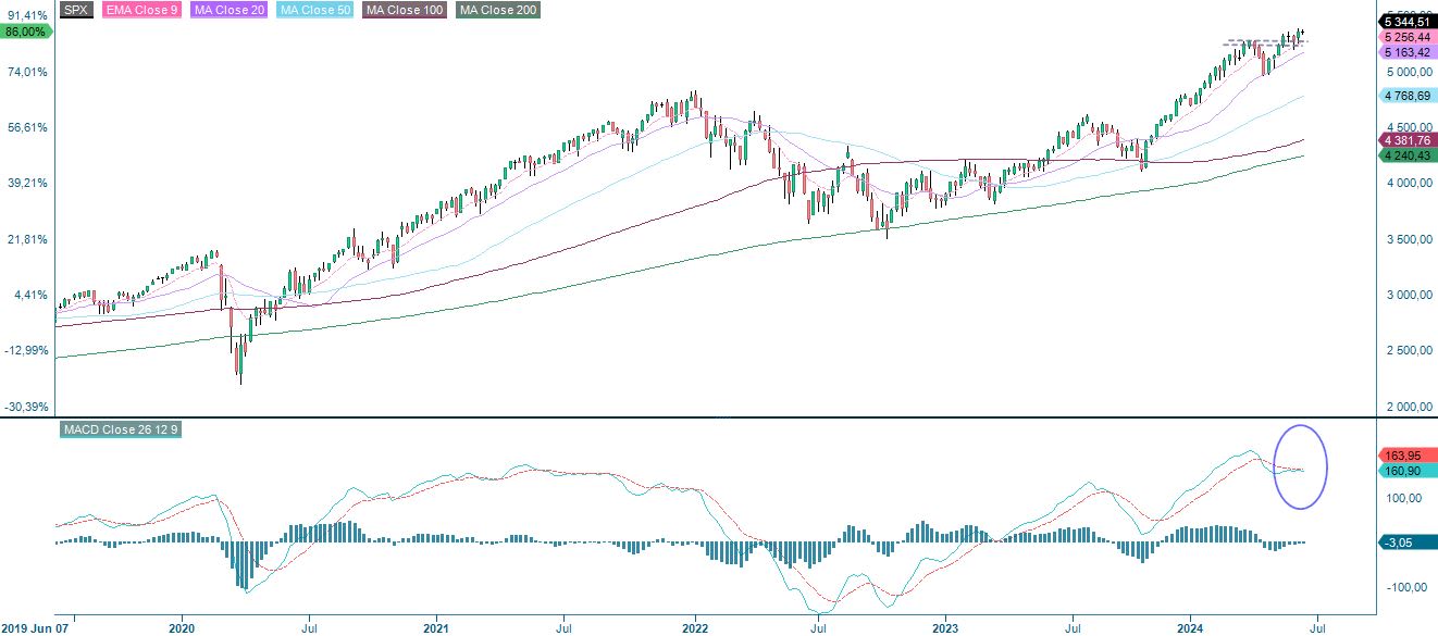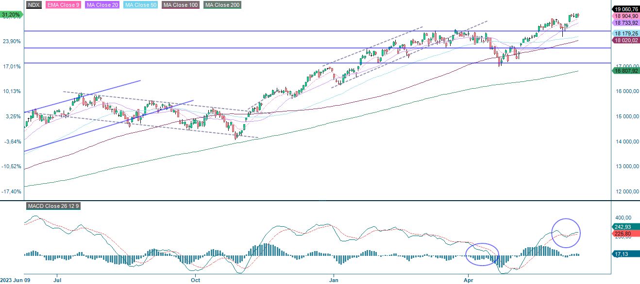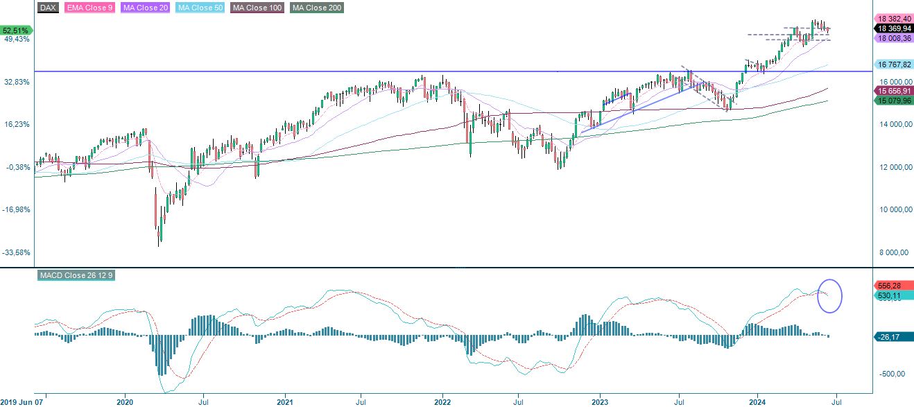 Nasdaq 100:n osalta kaupankäyntimalli näyttää samankaltaiselta. Molempien indeksien viikkokaavion MACD viittaa tekniseen heikkouteen positiivisella mutta heikkenevällä momentumilla.