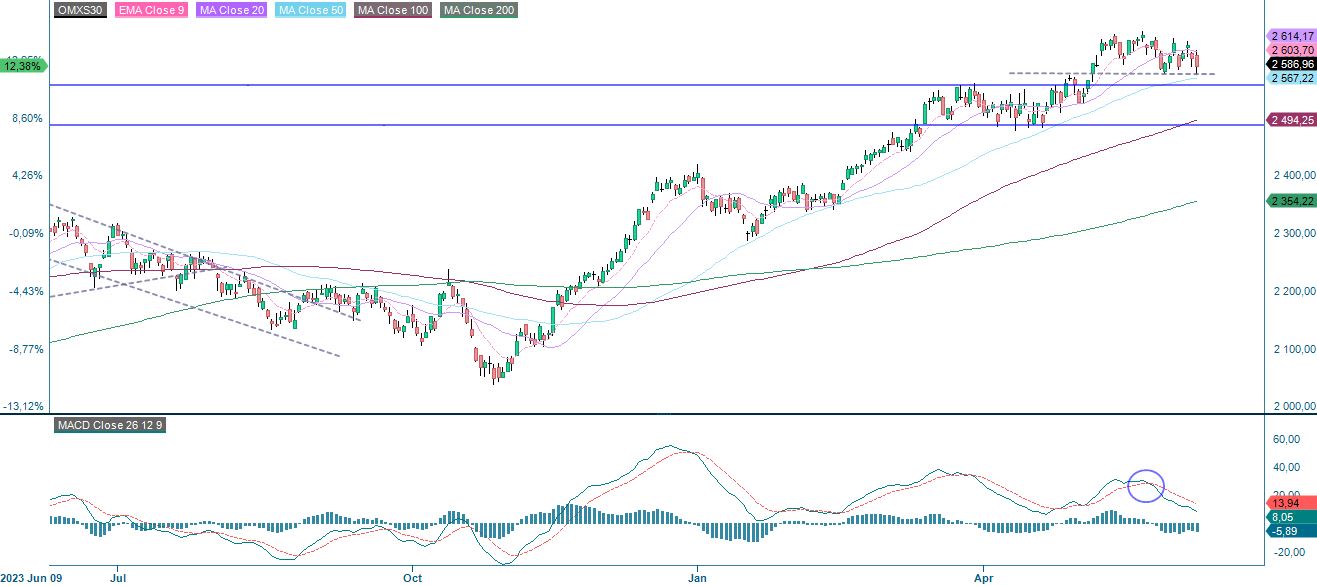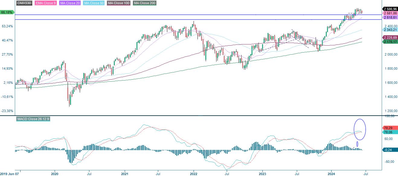 Teknisestä näkökulmasta Ruotsin OMXS30-markkinat ovat edelleen laskusuuntaiset. Kuten alla olevasta päiväkaaviosta käy ilmi, OMXS30-markkinoilla käydään kauppaa tukitasoa ja MA50:tä vasten 2 565 ja 2 575:n välillä. Huomionarvoista on myös, että MACD on tuottanut viikkokaaviossa pehmeän myyntisignaalin.
