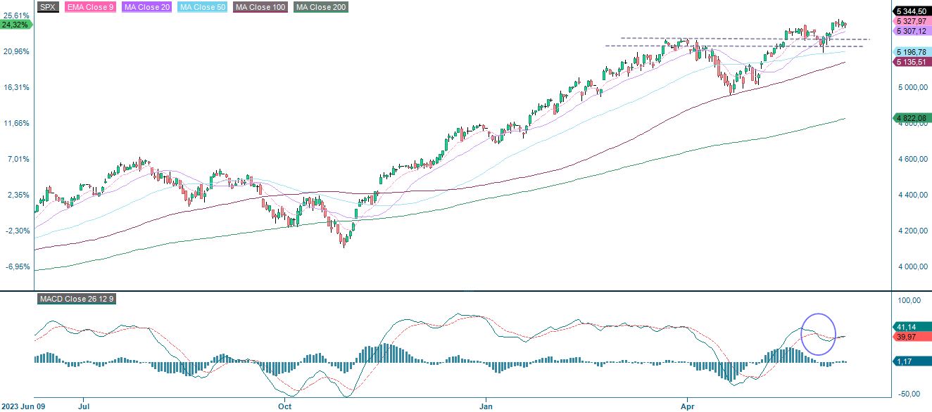 On mielenkiintoista, että yhdysvaltalaiset osakkeet pitävät hyvin pintansa huolimatta vahvoista tiedoista ja odotettua korkeammista koroista. Alla on S&P 500, joka on konsolidoitumassa. Huomaa, että MACD on positiivinen ja nouseva. MAG7-yhtiöiden vahva kehitys on auttanut asiaa. Yhdysvaltain tämänpäiväiset inflaatioluvut voivat kuitenkin muuttaa kaiken. Alapuolella EMA9 ja MA20 ovat ensimmäiset tukitasot, joita seuraa tukilinja 5 260 pisteessä.