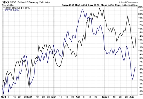 Yhdysvaltain valtion kymmenvuotisen joukkovelkakirjalainan tuotto (musta) vs. WTI-öljyhinta (sininen), kehitys tähän mennessä kuluvana vuonna