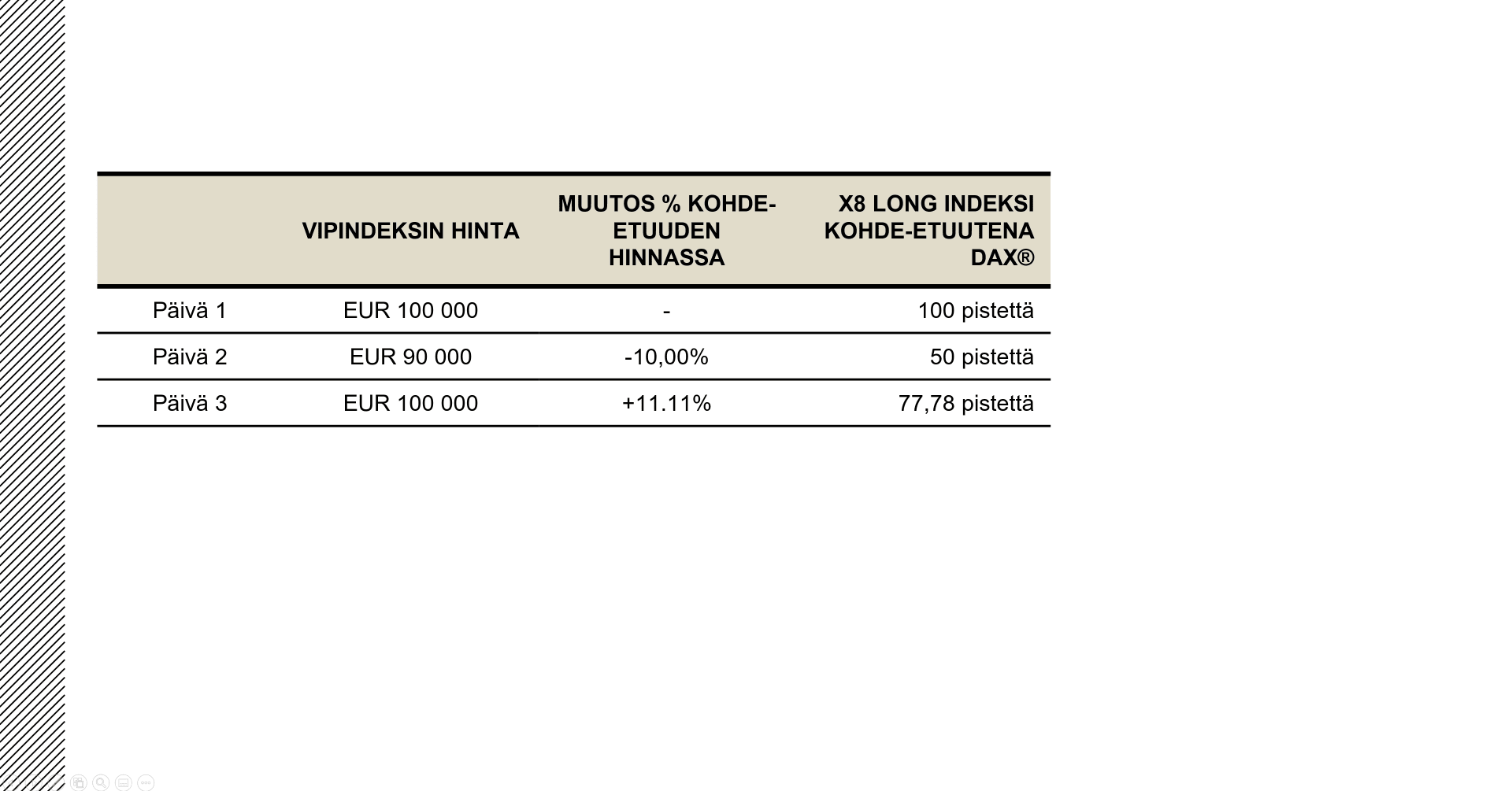 Ostetaan Bull & Bear sertifikaatti (pitkä), jonka kerroin on viisi (X5) DAX®-indeksiin viittaavaan vipuindeksiin ja jolloin DAX®:n alkuperäinen hintataso on 100,00 euroa. Jos DAX® laskee 10 prosenttia seuraavana päivänä, vipuindeksi menettää 50 prosenttia ja sen hinta on nyt 50 euroa. Jos DAX® nousisi seuraavana päivänä alkuperäiselle tasolleen - eli nousisi 11,11 prosenttia (100/90-1) - vipuindeksi ei kävisikään kauppaa 100:lla vaan ainoastaan 77,78:lla eurolla (50* (1+11,11%*5)). Näin ollen vipuindeksi olisi menettänyt 22,2 prosenttia, vaikka viiteinstrumentin hinnalla käytäisiin kauppaa alkuperäisellä tasolla. Bull X5 DAX®-indeksiin, jonka alkuperäinen viitehinta on 100 euroa.