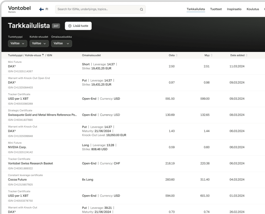 Onko sinulla jo tili?Kirjaudu sisääntaiLuo tiliTitleMrMrsEtunimiSukunimiSähköpostiosoiteSalasanaOlen lukenut ja hyväksynEhdot ja edellytyksetLuo tiliLuo ja hallinnoi strukturoitujen tuotteiden seurantalistaa