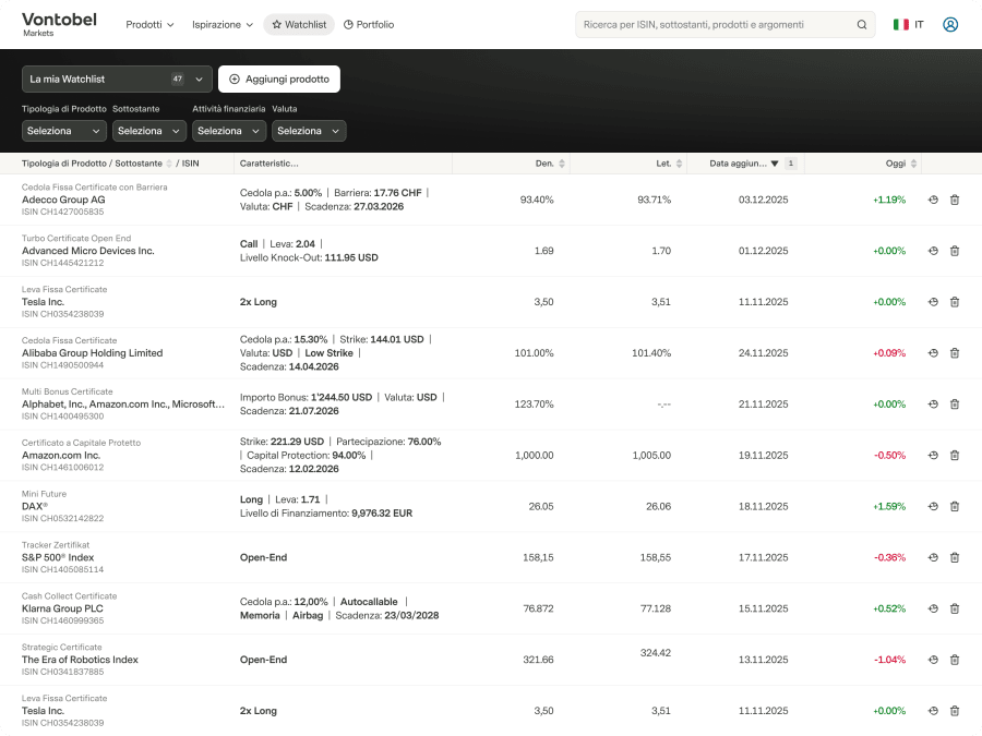 Hai già un account?AccessooCrea il tuo accountTitleSignorSignoraNomeCognomeIndirizzo emailPasswordHo letto e accetto iTermini e CondizioniCrea un accountCreare e gestire la Watchlist di prodotti strutturati1 / 0