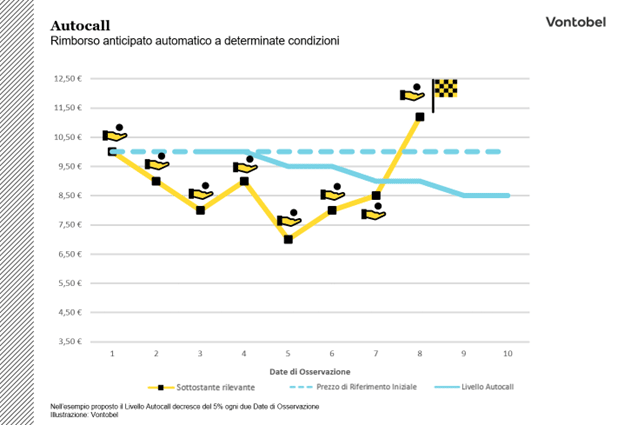 - Se l’attività sottostante rilevante si trova al di sotto del Livello Autocall, l'investitore riceve il premio e l'investimento prosegue.