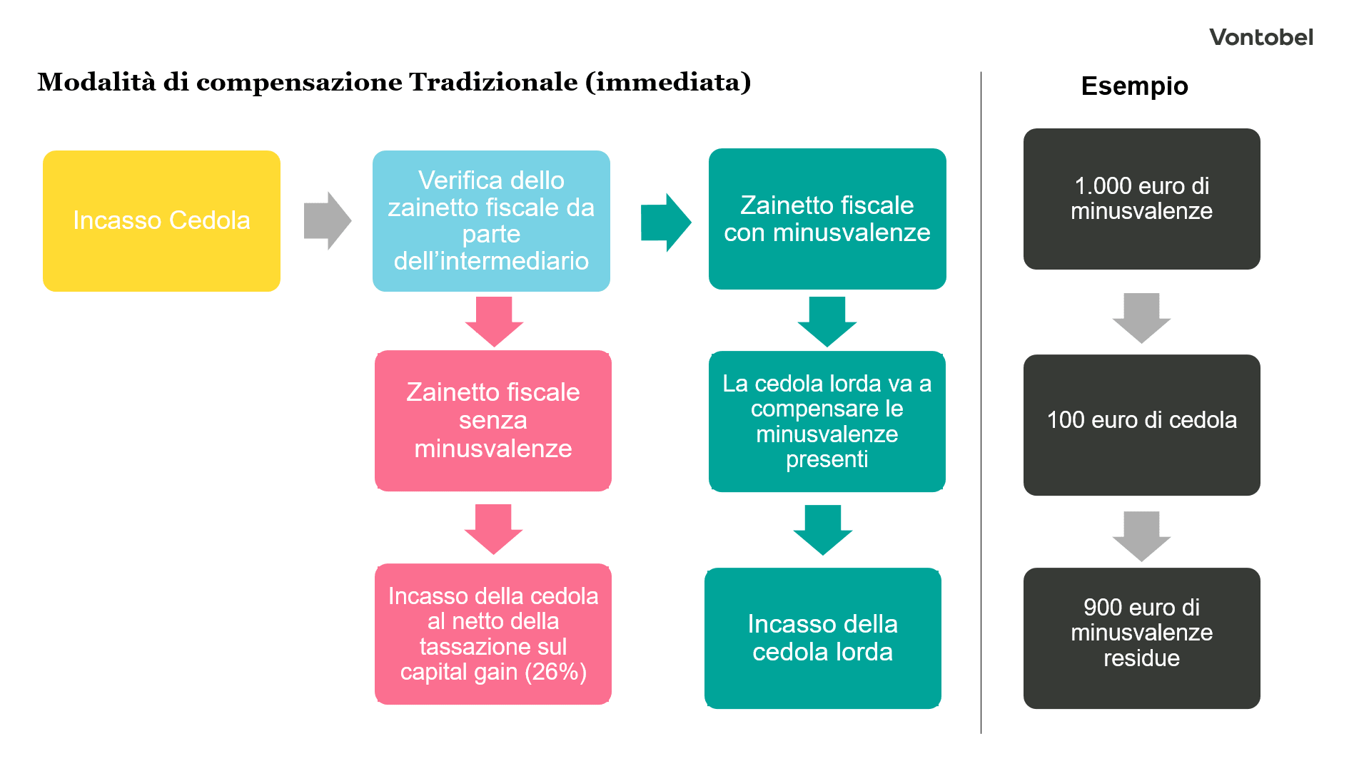 supponiamo che un investitore abbia una precedente minusvalenza di 1.000 euro. Acquista 1 Certificato a un costo complessivo di 1.000 euro. Dopo un mese, il Certificato paga una Maxi Cedola per un totale di 100 euro. Poiché il precedente deficit era di 1.000 euro, non c'è tassazione sulle cedole. La minusvalenza scende quindi a 900 euro.