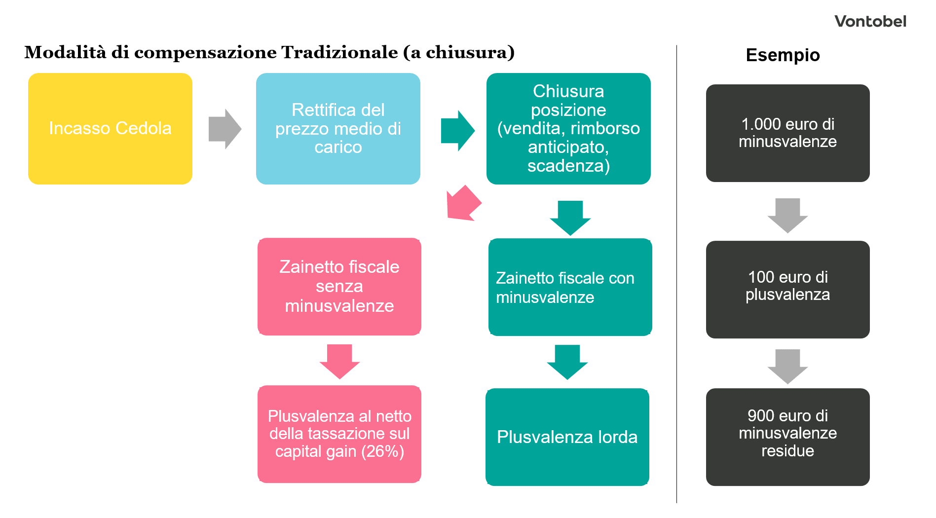 A questo punto in caso di rimborso anticipato a 1.000 euro, la plusvalenza di (1.000-900) = 100 euro sarà utilizzata per compensare e quindi per ridurre l’ammontare delle minusvalenze presenti all’interno dello zainetto fiscale.