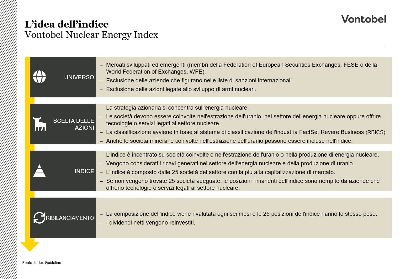 Il nuovo Vontobel Nuclear Energy Index è un modo per investire nel settore dell'energia nucleare. Attraverso lo Strategic Certificate sul Vontobel Nuclear Energy Index, gli investitori privati possono investire in società operanti in questo settore con un'unica transazione. Nell'indice possono essere inserite sia società provenienti dai paesi industrializzati sia società provenienti dai mercati emergenti. Per essere inserite nell'indice le società devono essere coinvolte o nell'estrazione dell'uranio o nella produzione di energia nucleare. La classificazione corrispondente è fatta secondo il FactSet Revere Business Industry Classification System (RBICS).