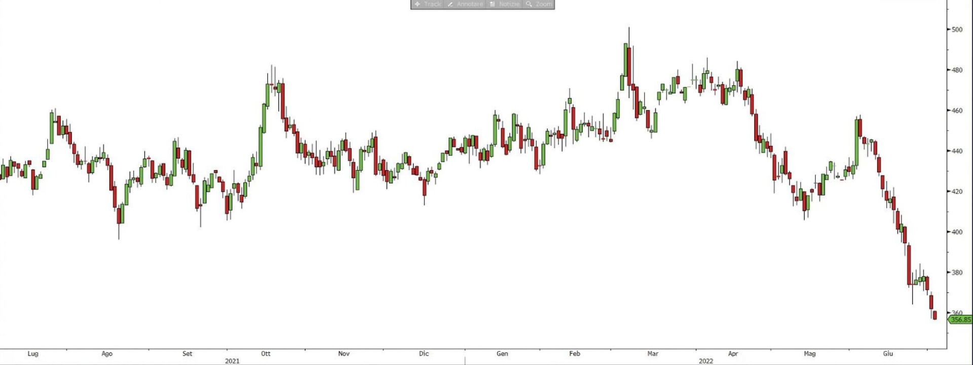 Da un punto di vista grafico, le quotazioni del rame hanno fornito un segnale negativo con la rottura dell’area supportiva compresa tra i 420 e i 409 dollari, dove passano rispettivamente la linea di tendenza ottenuta collegando i minimi del 4 marzo e 19 agosto 2021 e il livello orizzontale erditato dai minimi del 21 giugno 2021. La rottura di questo intorno ha permesso ai venditori di consolidare il vantaggio, portandosi ben al di sotto della soglia psicologica dei 400 dollari. L’obiettivo del fronte ribassista potrebbe ora essere identificato sui 350 dollari, dove transita il sostegno espresso dai massimi del 30 novembre 2020. Per i compratori, sarebbe positivo assistere ad una ripartenza oltre i 384 dollari prima, per poi passare a quella dei 425 dollari.