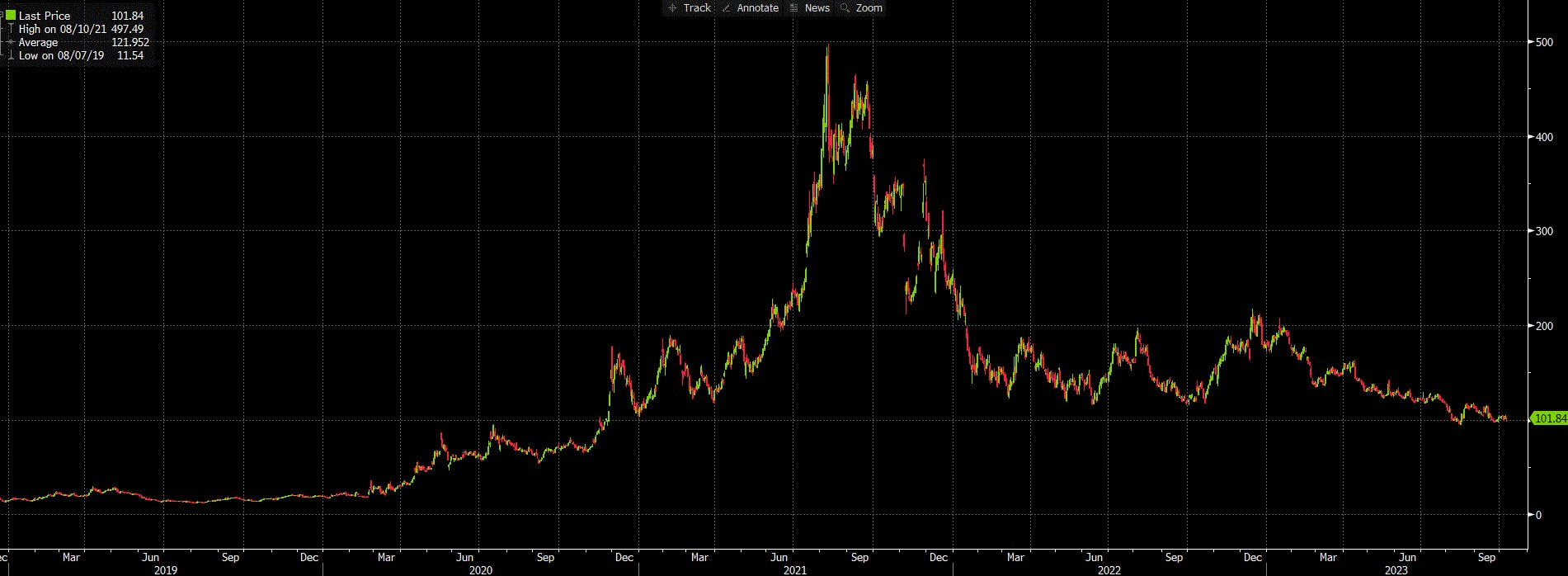 Il consensus degli analisti si aspetta che il bilancio del 2023 chiuda con ricavi a 7,2 miliardi di dollari, contro i 19,2 miliardi di dollari dell’anno precedente. Inoltre, su 24 analisti che seguono il titolo, 12 raccomandano di comprare, 2 di vendere e 10 hanno una posizione neutrale (“hold”).