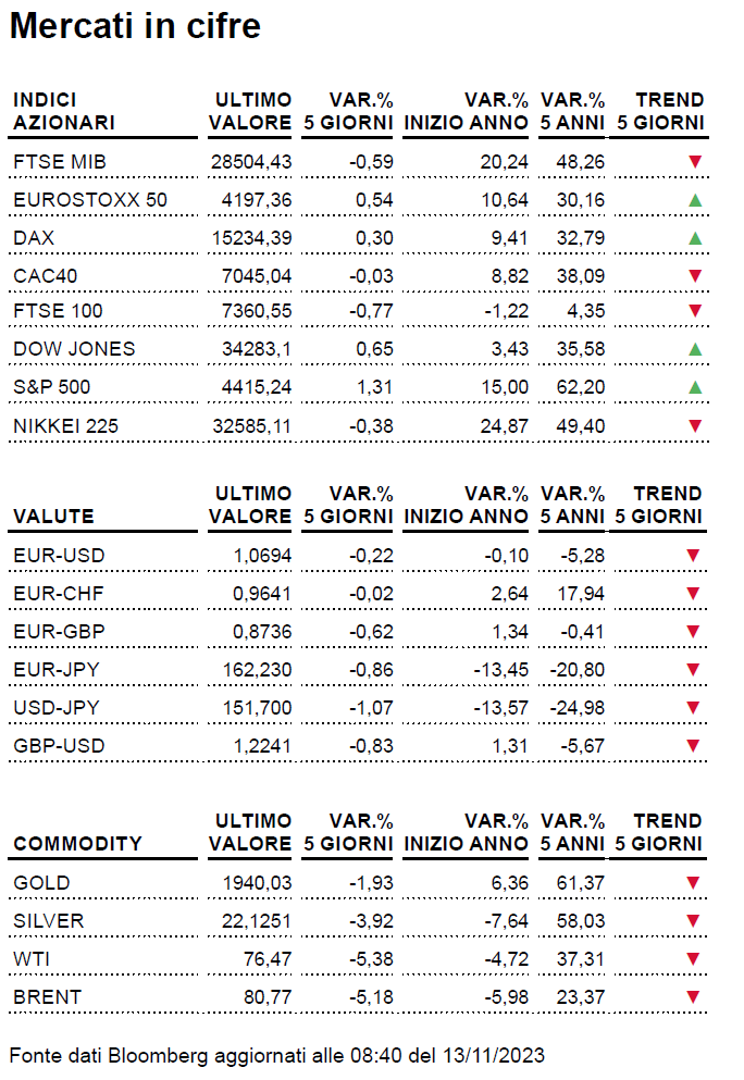 Il FedWatch Tool del CME Group mostra tuttavia come il mercato si attenda una fase di stabilità del costo del denaro fino alla primavera del 2024, con la finestra compresa tra marzo e giugno che potrebbe portare al primo taglio dei tassi. Un periodo temporale che anche in questo caso si lega allo scenario delineato da Christine Lagarde. Il Governatore europeo ha dichiarato che ci vorranno più di due trimestri prima che la BCE inizi a tagliare i tassi. Calendario alla mano, il mercato ha dunque cerchiato in rosso i meeting di aprile e giugno 2024. Alle parole dei due banchieri centrali ha fatto seguito un naturale innalzamento dei rendimenti obbligazionari e contestualmente una riduzione degli indici di Borsa. Dopo i rialzi della scorsa settimana, un’altrettanto salutare frenata per smussare l’ottimismo.