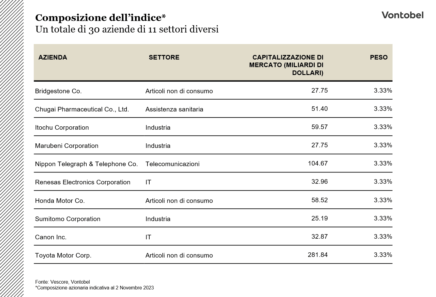 Il "Vontobel Japan Equity Strategy Index" potrebbe essere un'alternativa interessante per gli investitori che desiderano concentrarsi su una selezione di società con una ponderazione più elevata delle singole società e dei settori rispetto al NIKKEI 225, e che potrebbero beneficiare in particolare del mutato contesto macroeconomico in Giappone. Il prodotto potrebbe anche essere adatto per gli investitori che non desiderano dare un'occhiata più da vicino alle azioni giapponesi, ma vogliono comunque costruire un'esposizione settoriale.