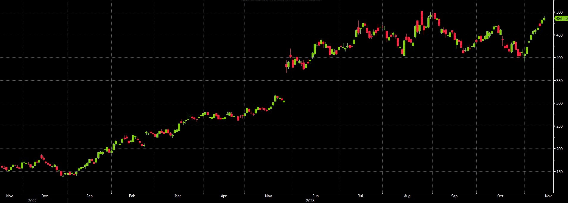 Il quadro tecnico di Nvidia mostra una netta inclinazione al rialzo nel breve termine, specialmente considerando i minimi toccati alla fine di ottobre scorso intorno a 390 dollari. Con il recente aumento registrato tra venerdì e lunedì 13 novembre 2023, i prezzi hanno superato al rialzo la resistenza a 476 dollari, indicando ora una prospettiva verso il livello dei 500 dollari.