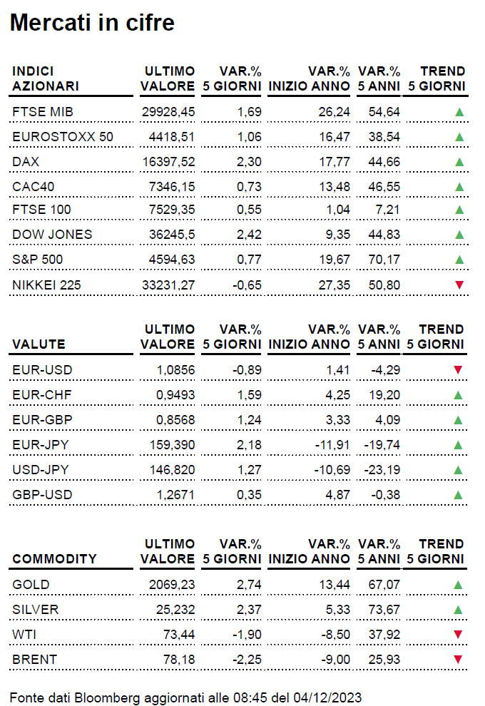 O almeno lascia maggior libertà ai banchieri centrali di farlo. In questa direzione emblematico l’input di Goldman Sachs. Gli analisti della banca d’affari ora prevedono che la BCE effettui il primo taglio dei tassi di interesse nel secondo trimestre del 2024, in precedenza le stime erano per il terzo trimestre del prossimo anno. Che l’economia stia iniziando a dare segnali di rallentamento lo si nota più in Europa che in America. In Italia l’ISTAT ha rivisto i dati del Pil del terzo quarto 2023 a +0,1%, ma soprattutto ha confermato la stagnazione dell’economia. L’ufficio studi Prometeia ipotizza per il quarto trimestre una lieve contrazione. A livello generale, l’OCSE si è detta negativa sull’economia mondiale fino al 2025. I prezzi del petrolio, in discesa nonostante il taglio dell’OPEC, vanno in questa direzione. E il calo del greggio è un ulteriore boost per il mercato azionario all’interno di quell’equazione che lega il rientro dell’inflazione a tassi di interesse futuri più bassi.