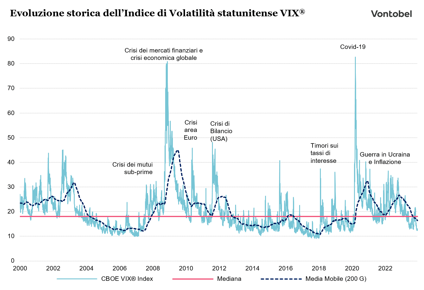 Come mostra il grafico, si verificano sempre forti picchi di volatilità al manifestarsi di tempeste e crolli sui mercati. Il VIX®, lanciato nel 1993, ha raggiunto il suo livello massimo nell'ottobre 2008, dopo il crollo della banca d'investimento statunitense Lehman Brothers e il quasi collasso del sistema finanziario globale. In quell'occasione, l'indice VIX® statunitense è salito quasi al 90%. Ha raggiunto i valori massimi anche nel marzo 2020, in seguito allo scoppio della pandemia Covid-19 e alle conseguenti chiusure globali.