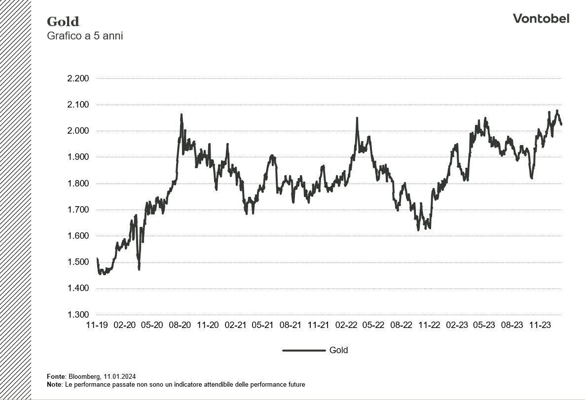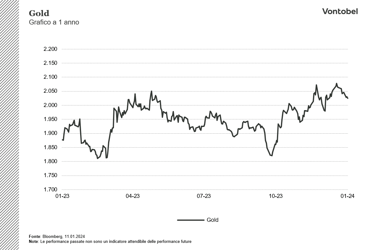 Il Market Outlook 2024 di Vontobel (consultabile al seguente link https://markets.vontobel.com/it-it/ispirazione/46316/investment-outlook-2024-anticipare-gli-eventi-per-cogliere-le-opportunita) analizza nel dettaglio l’evoluzione del contesto macroeconomico e dei mercati finanziari nel 2024 evidenziando come il ciclo di inasprimento della Fed (e tutto ciò che ne consegue) hanno rappresentato un catalizzatore positivo per l’oro. Anche nell’ambito fisico la domanda di oro richiesta rimane robusta: la Svizzera, noto hub per il commercio dell'oro, ha registrato un'esportazione di oltre 150 tonnellate di oro a ottobre, raggiungendo il livello più elevato da maggio. Di queste, circa 49 tonnellate, che rappresentano un incremento del 60% rispetto al periodo precedente, sono state inviate in India, leader mondiale per il consumo di oro.