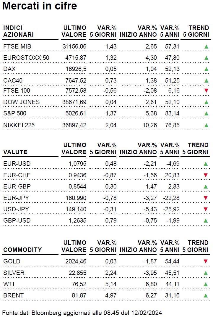 In assenza di dati in arrivo dalla Cina, il Dragone è alle prese coi festeggiamenti in occasione del Capodanno, quella che inizia oggi sarà una settimana particolarmente importante per l’economia USA. Domani i riflettori saranno puntati sull’indice che misura l’andamento dell’inflazione mentre venerdì sarà la volta dei prezzi alla produzione: anche se al momento il CME FedWatch Tool stima con una probabilità di oltre 80 punti percentuali che i tassi resteranno al livello attuale nel meeting di marzo, indicazioni sotto le stime potrebbero far cambiare idea alla banca centrale guidata da Jerome Powell. Per la stessa ragione, giovedì gli operatori seguiranno con particolare attenzione l’andamento delle vendite al dettaglio e della produzione industriale che, se dovessero evidenziare difficoltà, rappresenterebbero un assist per quei membri della Banca centrale USA favorevoli ad un allentamento delle condizioni monetarie. Per quanto riguarda la Zona Euro, domani sarà la volta dell’indice ZEW (quello che misura il sentiment degli investitori istituzionali tedeschi), mercoledì dei dati sulla crescita dell’economia e sull’andamento della produzione industriale e giovedì focus sull’indicatore che misura l’andamento della bilancia commerciale. Ma non solo appuntamenti macroeconomici: dopo l’abbuffata di trimestrali bancarie, a Piazza Affari nel corso dell’ottava ad alzare il velo sui conti del quarto trimestre e dell’intero 2023 saranno big del calibro di Telecom Italia, Eni, Stellantis e Unipol.