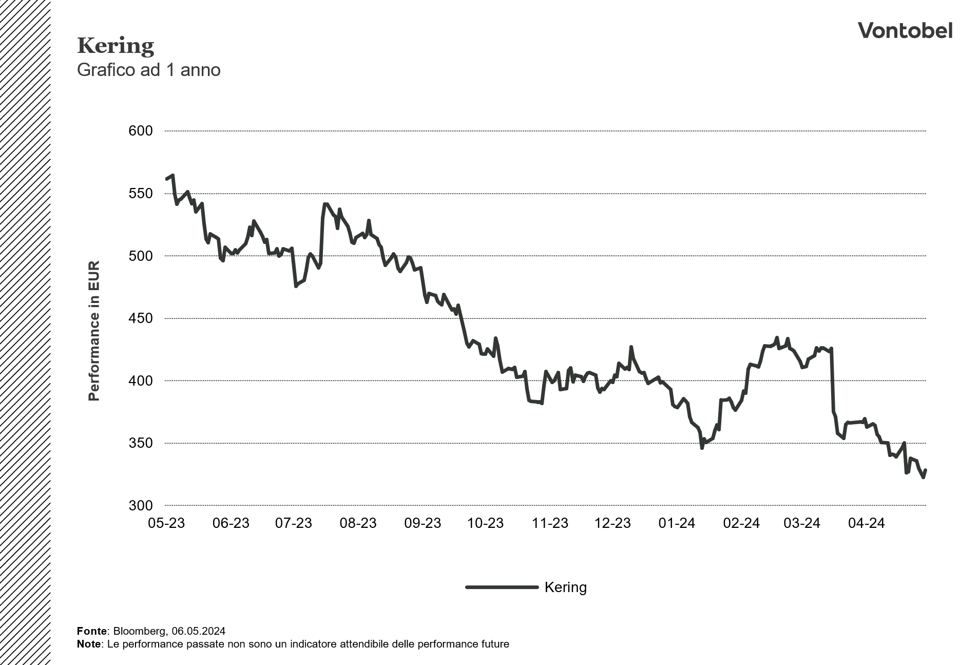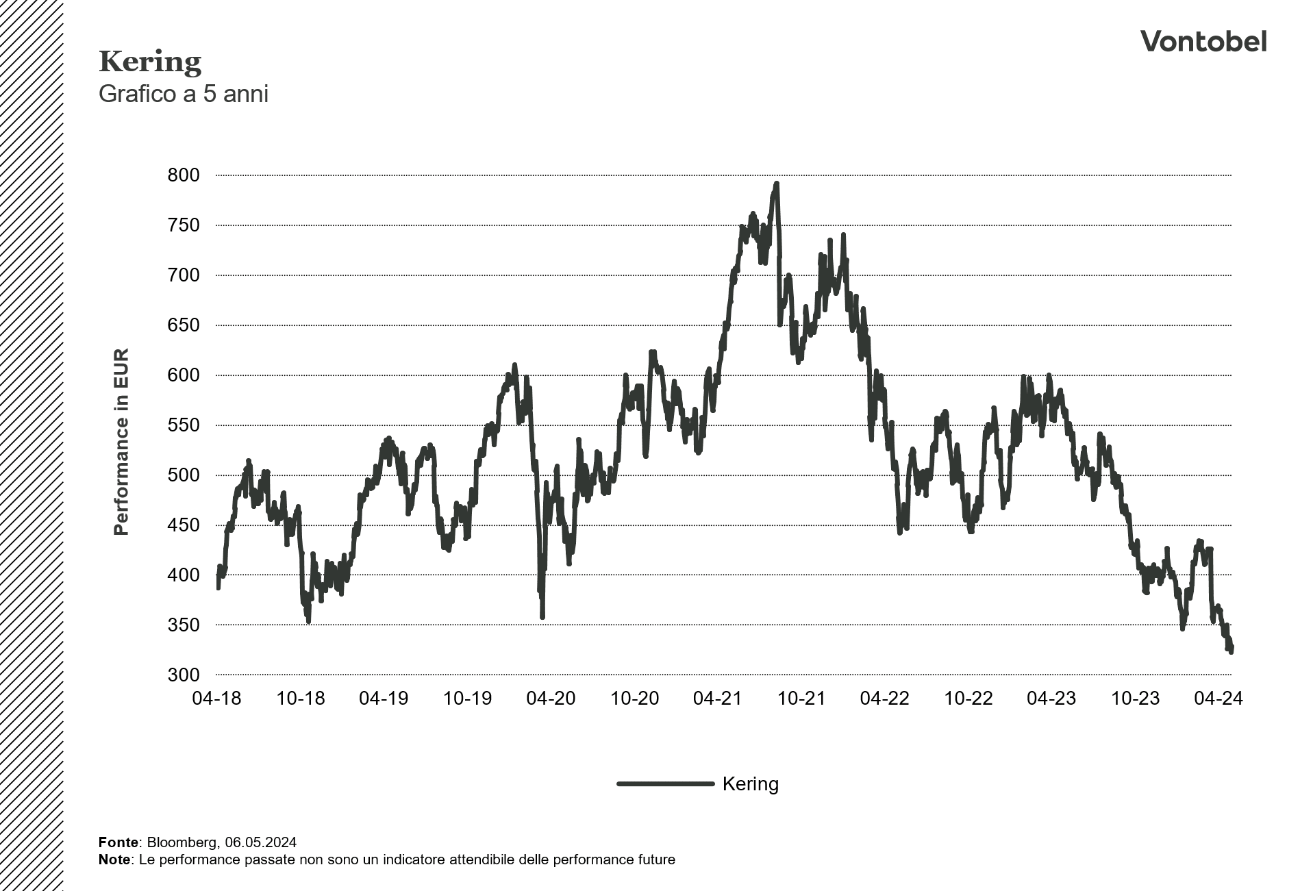 Il presente documento è stato preparato da ELP SA (l’editore), Sede Legale Corso San Gottardo 8/A, 6830 - Chiasso (Svizzera), in completa autonomia e riflette quindi esclusivamente le opinioni e le valutazioni dell’editore stesso. La pubblicazione è sponsorizzata da Bank Vontobel Europe AG che potrebbe essere controparte di operazioni aventi ad oggetto gli strumenti finanziari trattati nel presente documento. Il presente documento non rappresenta né una consulenza d’investimento né una raccomandazione di investimento di tipo finanziario, contabile, legale o altro o di strategia d’investimento, ma una pubblicità. Le informazioni complete sugli strumenti finanziari, compresi i rischi, sono descritti nel rispettivo prospetto di base, unitamente ad eventuali supplementi, nonché nelle rispettive Condizioni Definitive. Il rispettivo prospetto di base e le Condizioni Definitive costituiscono gli unici documenti di vendita vincolanti per gli strumenti finanziari. Si raccomanda ai potenziali investitori di leggere attentamente tali documenti prima di effettuare qualsiasi decisione di investimento, al fine di comprendere appieno i rischi e i vantaggi potenziali derivanti dalla decisione di investire negli strumenti finanziari. Gli investitori possono scaricare questi documenti e il documento contenente le informazioni chiave (KID) dal sito internet dell’emittente, Vontobel Financial Products GmbH, Bockenheimer Landstrasse 24, 60323 Francoforte sul Meno, Germania, su http://prospectus.vontobel.com/. Inoltre, il prospetto di base, gli eventuali supplementi al pro-spetto di base e le Condizioni Definitive sono disponibili gratuitamente presso l’emittente. L’approvazione del prospetto da parte dell’autorità di riferimento non deve essere considerata un parere favorevole sugli strumenti finanziari offerti o ammessi alla negoziazione in un mercato regolamentato. Gli strumenti finanziari sono prodotti non semplici e di difficile comprensione. Il presente documento contiene un’indicazione dei rendimenti passati degli strumenti finanziari. I rendimenti passati non sono un indicatore affidabile dei risultati futuri. Il presente documento e le informazioni in esso contenute possono essere distribuiti o pubblicati solo nei paesi in cui tale distribuzione o pubblicazione è consentita dalla legge applicabile. Come indicato nel relativo prospetto di base, la distribuzione degli strumenti finanziari menzionati in queste informazioni è soggetta a restrizioni in alcune giurisdizioni. Il presente documento non può essere riprodotto o ridistribuito senza previa autorizzazione dell’editore.
