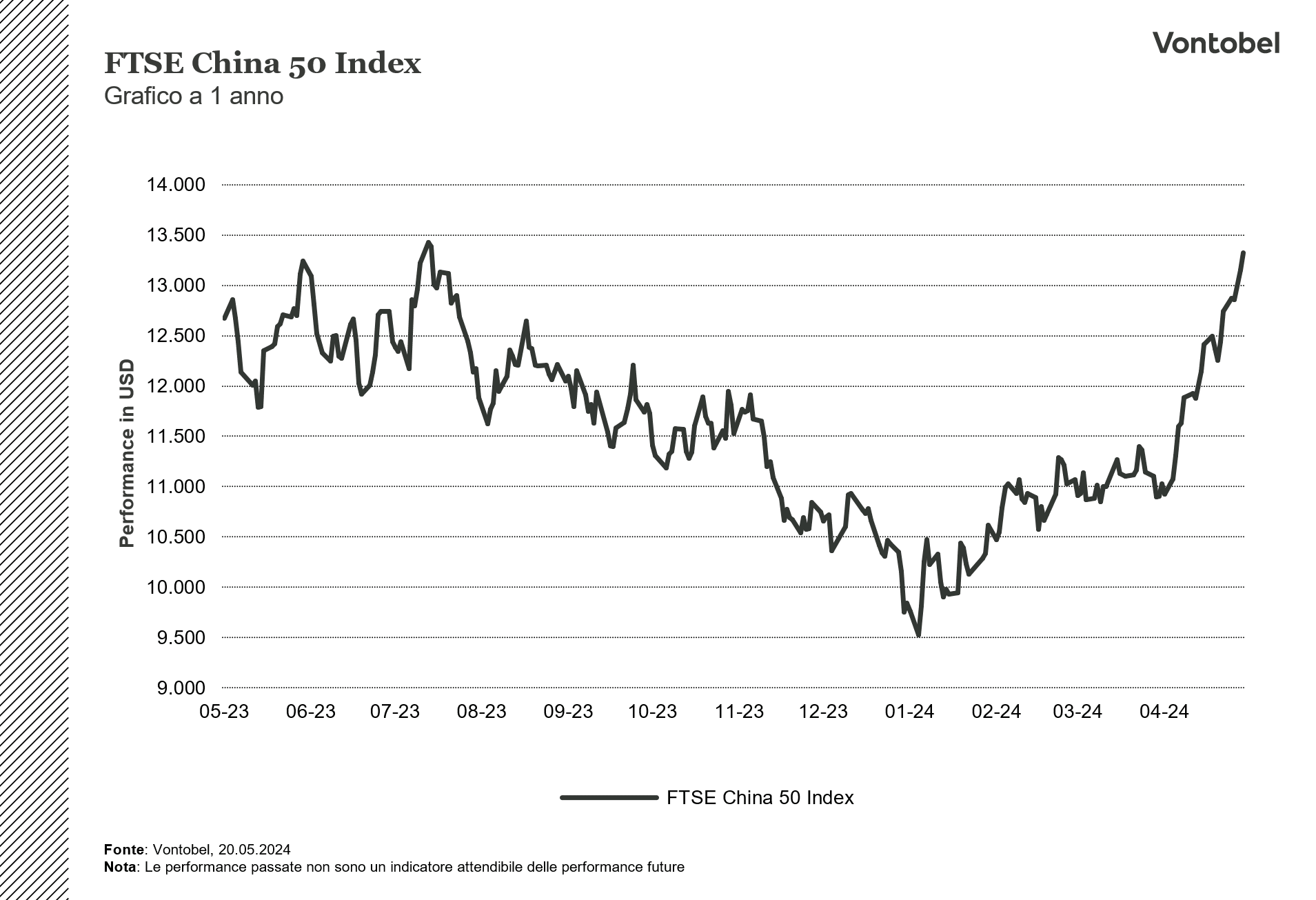 Il presente documento è stato preparato da ELP SA (l’editore), Sede Legale Corso San Gottardo 8/A, 6830 - Chiasso (Svizzera), in completa autonomia e riflette quindi esclusivamente le opinioni e le valutazioni dell’editore stesso. La pubblicazione è sponsorizzata da Bank Vontobel Europe AG che potrebbe essere controparte di operazioni aventi ad oggetto gli strumenti finanziari trattati nel presente documento. Il presente documento non rappresenta né una consulenza d’investimento né una raccomandazione di investimento di tipo finanziario, contabile, legale o altro o di strategia d’investimento, ma una pubblicità. Le informazioni complete sugli strumenti finanziari, compresi i rischi, sono descritti nel rispettivo prospetto di base, unitamente ad eventuali supplementi, nonché nelle rispettive Condizioni Definitive. Il rispettivo prospetto di base e le Condizioni Definitive costituiscono gli unici documenti di vendita vincolanti per gli strumenti finanziari. Si raccomanda ai potenziali investitori di leggere attentamente tali documenti prima di effettuare qualsiasi decisione di investimento, al fine di comprendere appieno i rischi e i vantaggi potenziali derivanti dalla decisione di investire negli strumenti finanziari. Gli investitori possono scaricare questi documenti e il documento contenente le informazioni chiave (KID) dal sito internet dell’emittente, Vontobel Financial Products GmbH, Bockenheimer Landstrasse 24, 60323 Francoforte sul Meno, Germania, su http://prospectus.vontobel.com/. Inoltre, il prospetto di base, gli eventuali supplementi al pro-spetto di base e le Condizioni Definitive sono disponibili gratuitamente presso l’emittente. L’approvazione del prospetto da parte dell’autorità di riferimento non deve essere considerata un parere favorevole sugli strumenti finanziari offerti o ammessi alla negoziazione in un mercato regolamentato. Gli strumenti finanziari sono prodotti non semplici e di difficile comprensione. Il presente documento contiene un’indicazione dei rendimenti passati degli strumenti finanziari. I rendimenti passati non sono un indicatore affidabile dei risultati futuri. Il presente documento e le informazioni in esso contenute possono essere distribuiti o pubblicati solo nei paesi in cui tale distribuzione o pubblicazione è consentita dalla legge applicabile. Come indicato nel relativo prospetto di base, la distribuzione degli strumenti finanziari menzionati in queste informazioni è soggetta a restrizioni in alcune giurisdizioni. Il presente documento non può essere riprodotto o ridistribuito senza previa autorizzazione dell’editore.