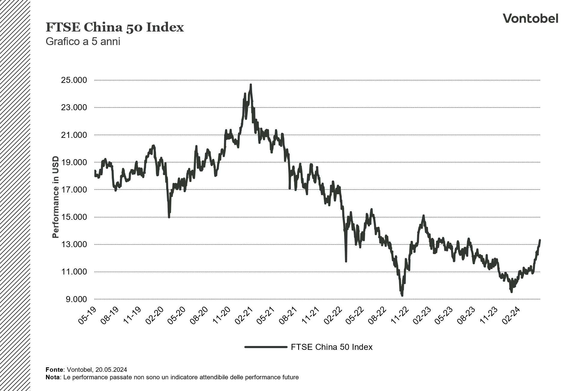 Il presente documento non rappresenta né una consulenza d’investimento né una raccomandazione di investimento di tipo finanziario, contabile, legale o altro o di strategia d’investimento, ma una pubblicità. Le informazioni complete sugli strumenti finanziari, compresi i rischi, sono descritte nel rispettivo prospetto di base, unitamente ad eventuali supplementi, nonché nelle rispettive Condizioni Definitive. Il rispettivo prospetto di base e le Condizioni Definitive costituiscono gli unici documenti di vendita vincolanti per gli strumenti finanziari. Si raccomanda ai potenziali investitori di leggere attentamente tali documenti prima di effettuare qualsiasi decisione di investimento, al fine di comprendere appieno i rischi e i vantaggi potenziali derivanti dalla decisione di investire negli strumenti finanziari. Gli investitori possono scaricare questi documenti e il documento contenente le informazioni chiave (KID) dal sito internet dell’emittente, Vontobel Financial Products GmbH, Bockenheimer Landstrasse 24, 60323 Francoforte sul Meno, Germania, su “http:// prospectus.vontobel.com/”. Inoltre, il prospetto di base, gli eventuali supplementi al prospetto di base e le Condizioni Definitive sono disponibili gratuitamente presso l’emittente. L’approvazione del prospetto da parte dell’autorità di riferimento non deve essere considerata un parere favorevole sugli strumenti finanziari offerti o ammessi alla negoziazione in un mercato regolamentato. Gli strumenti finanziari sono prodotti non semplici e di difficile comprensione. Il presente documento contiene un’indicazione dei rendimenti passati degli strumenti finanziari. I rendimenti passati non sono un indicatore affidabile dei risultati futuri. Il presente documento e le informazioni in esso contenute possono essere distribuiti o pubblicati solo nei paesi in cui tale distribuzione o pubblicazione è consentita dalla legge applicabile. Come indicato nel relativo prospetto di base, la distribuzione degli strumenti finanziari menzionati in queste informazioni è soggetta a restrizioni in alcune giurisdizioni. Questo messaggio pubblicitario non può essere riprodotto o ridistribuito senza previa autorizzazione dell’editore. © 2025 Bank Vontobel Europe AG e/o le sue affiliate. Tutti i diritti riservati.