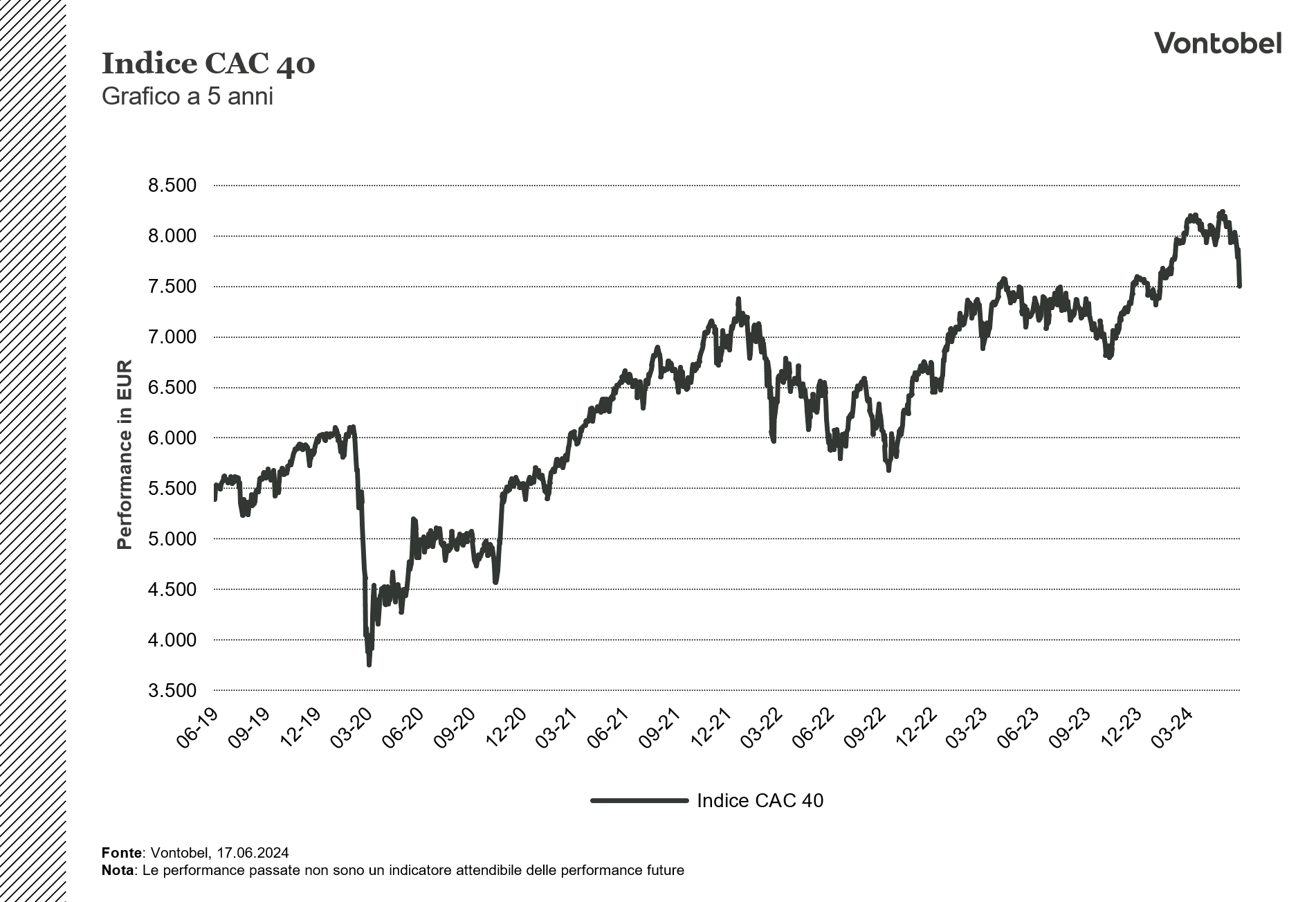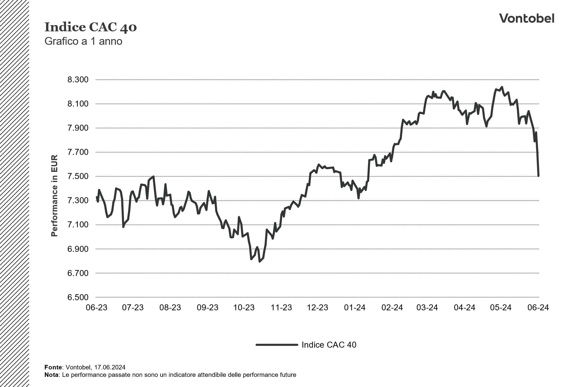 Il presente documento non rappresenta né una consulenza d’investimento né una raccomandazione di investimento di tipo finanziario, contabile, legale o altro o di strategia d’investimento, ma una pubblicità. Le informazioni complete sugli strumenti finanziari, compresi i rischi, sono descritte nel rispettivo prospetto di base, unitamente ad eventuali supplementi, nonché nelle rispettive Condizioni Definitive. Il rispettivo prospetto di base e le Condizioni Definitive costituiscono gli unici documenti di vendita vincolanti per gli strumenti finanziari. Si raccomanda ai potenziali investitori di leggere attentamente tali documenti prima di effettuare qualsiasi decisione di investimento, al fine di comprendere appieno i rischi e i vantaggi potenziali derivanti dalla decisione di investire negli strumenti finanziari. Gli investitori possono scaricare questi documenti e il documento contenente le informazioni chiave (KID) dal sito internet dell’emittente, Vontobel Financial Products GmbH, Bockenheimer Landstrasse 24, 60323 Francoforte sul Meno, Germania, su “http:// prospectus.vontobel.com/”. Inoltre, il prospetto di base, gli eventuali supplementi al prospetto di base e le Condizioni Definitive sono disponibili gratuitamente presso l’emittente. L’approvazione del prospetto da parte dell’autorità di riferimento non deve essere considerata un parere favorevole sugli strumenti finanziari offerti o ammessi alla negoziazione in un mercato regolamentato. Gli strumenti finanziari sono prodotti non semplici e di difficile comprensione. Il presente documento contiene un’indicazione dei rendimenti passati degli strumenti finanziari. I rendimenti passati non sono un indicatore affidabile dei risultati futuri. Il presente documento e le informazioni in esso contenute possono essere distribuiti o pubblicati solo nei paesi in cui tale distribuzione o pubblicazione è consentita dalla legge applicabile. Come indicato nel relativo prospetto di base, la distribuzione degli strumenti finanziari menzionati in queste informazioni è soggetta a restrizioni in alcune giurisdizioni. Questo messaggio pubblicitario non può essere riprodotto o ridistribuito senza previa autorizzazione dell’editore. © 2025 Bank Vontobel Europe AG e/o le sue affiliate. Tutti i diritti riservati.
