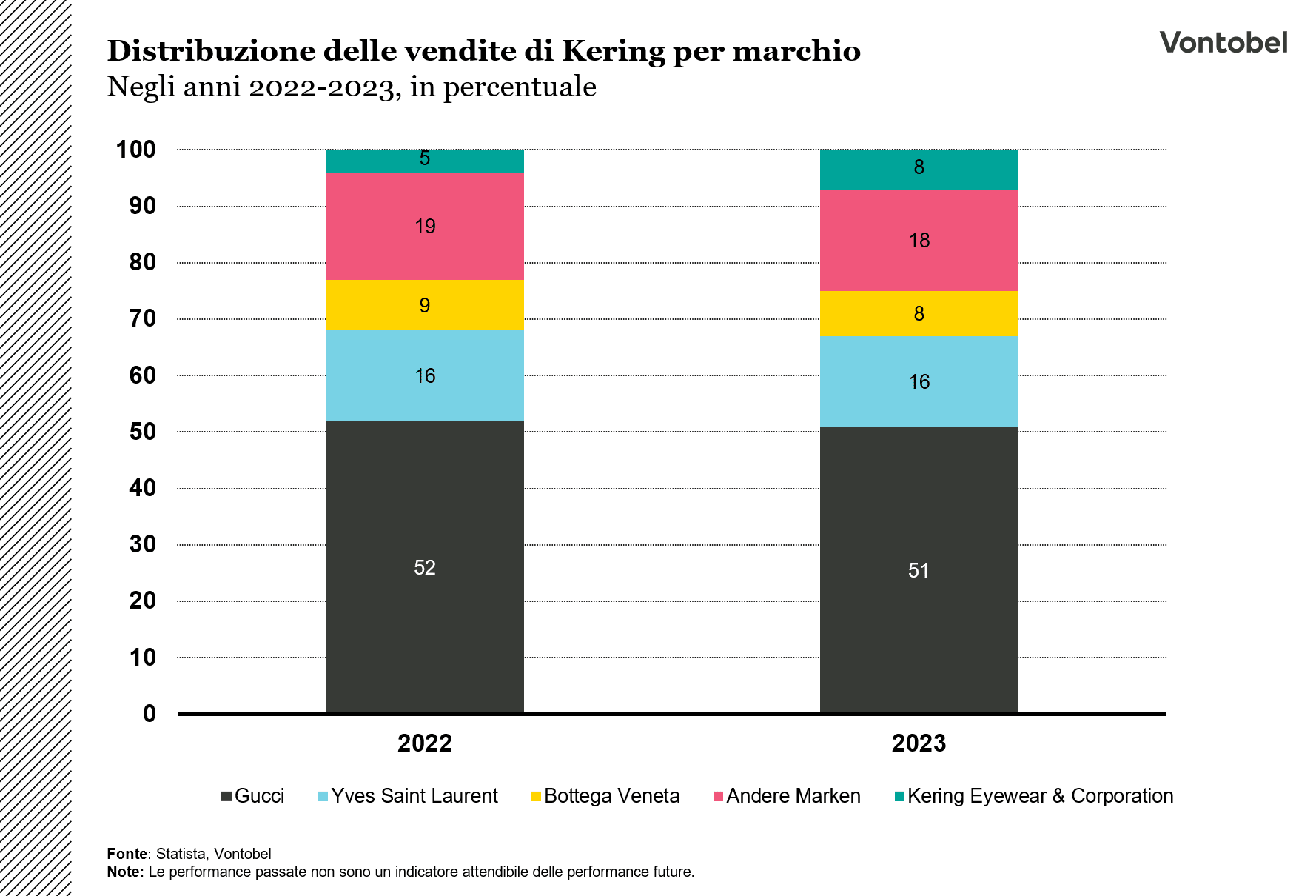 Kering è un'azienda globale nel settore del lusso che riunisce sotto il suo ombrello una serie di marchi. Tra questi figurano rinomate case di moda come Gucci, Yves Saint Laurent, Bottega Veneta, Balenciaga e Alexander McQueen. Gucci, la forza trainante del portafoglio di brand, ha recentemente subito un rallentamento dovuto in buona parte ad un indebolimento del mercato asiatico dove il marchio realizza circa un terzo delle sue vendite. Hanno invece riscontrato sviluppi positivi i marchi Balenciaga e Yves Saint Laurent, quest’ultimo ha contribuito per circa il 16% alle vendite di Kering nel 2023 ed è il secondo motore delle vendite insieme a Gucci. Con Kering Eyewear, il Gruppo è anche leader nel settore dell'occhialeria, che rappresenta quasi l'8% delle vendite nel 2023 (in crescita dal 5% dell'anno precedente).