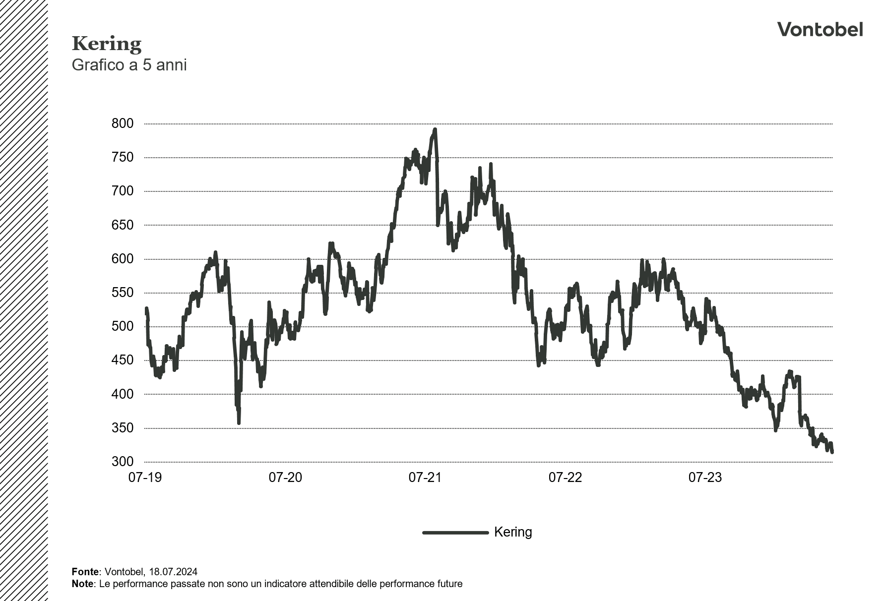 In un contesto di normalizzazione del settore e di ristrutturazione in corso di alcuni marchi in portafoglio (tra cui Gucci), il fatturato di Kering è sceso dell'11%, assestandosi a 4,5 miliardi di euro nel primo trimestre del 2024. Mentre l'andamento delle vendite nei mercati dell'Europa occidentale, del Nord America e del Giappone è stato in linea con il quarto trimestre del 2023, la regione Asia-Pacifico ha registrato un calo più marcato. Nel primo trimestre del 2024, Gucci ha generato un fatturato di 2,1 miliardi di euro (in calo del 18% su base comparativa), Yves Saint Laurent ha generato 740 milioni di euro e Bottega Veneta ha generato vendite per 388 milioni di euro. Mentre per quanto riguarda la voce "Altri marchi" sono stati generati altri 844 milioni di euro di fatturato. Nella relazione trimestrale, Kering dichiara di star investendo molto nello sviluppo dei suoi marchi di moda per rafforzarne l'attrattiva e l'esclusività nel lungo termine. Nell'ambito della strategia e della visione aziendale, vengono perseguiti due obiettivi principali: mantenere una crescita redditizia a lungo termine e confermare il proprio status di gruppo più influente nel settore del lusso. Nel 2024, l'impatto della strategia di investimento di Kering potrebbe inizialmente pesare sul risultato operativo del Gruppo in un contesto in cui la crescita del settore del lusso continua a normalizzarsi. Le azioni di Kering hanno perso più del 30% del loro valore lo scorso anno e sono attualmente scambiate ai minimi di cinque anni. L'inversione di tendenza di Gucci e il sentimento dei consumatori in Asia, tra gli altri fattori, saranno decisivi per l'ulteriore sviluppo del prezzo delle azioni.