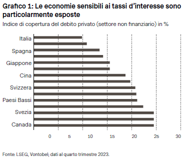 I rialzi aggressivi dei tassi d’interesse ad opera delle banche centrali globali hanno lasciato il segno su molte economie, soprattutto quelle sensibili alle variazioni dei tassi (grafico 1). Ne è un perfetto esempio la Svezia, tra i paesi più ricchi d’Europa, che ha visto calare i prezzi delle case e rallentare l’attività di costruzione a causa di una preferenza per i mutui a tasso variabile che ha innescato una recessione tecnica nel terzo trimestre 2023. L’outlook per il 2024 rimane impegnativo: ad aprile 2024 i fallimenti in Svezia sono aumentati del 72% su base annua e a maggio il tasso di disoccupazione si è attestato poco sotto il 9%6. Anche Europa e Regno Unito sono scivolate in recessione verso la fine dell’anno.