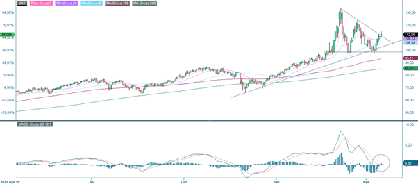 Brent oil has regained some strength after China seems to be looking to ease its restrictions, meaning increased activity and worries about supply in the wake of the Ukraine crisis. However, the daily chart below shows that the oil price is trading in a large bearish descending triangle that tends to break on the downside. Going for a short position may be considered very risky as momentum is picking up (see MACD). A more attractive timing will be when (and if) brent oil breaks the support level below the USD 100-level. In such a scenario, the target price given by the formation is around 70 USD/barrel.