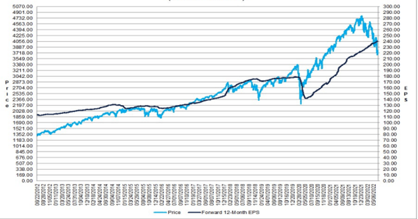 S&P 500 Change in forwarding 12-Month EPS versus Change in Price: 10 Years.