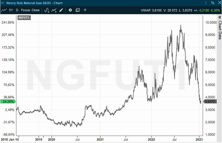 Henry Hub Natural Gas nådde sin foreløpige pristopp på 10,028 USD i sommer. Etter det har tendensen stort sett vært nedover, og fallet har tiltatt betydelig de siste uker. Fra forrige lokale topp rundt 7 USD 13. desember nådde Henry Hub gassen en foreløpig intradag bunn på 3,384 USD den 13. januar.