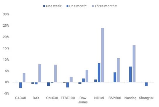 Most of the world's stock markets have performed relatively strongly over the past month and quarter. The Nikkei is the best performer, up 24% over the last quarter, followed by the Nasdaq, up 16%. But the S&P500 (+11%) also posted a double-digit gain over the past three months.
