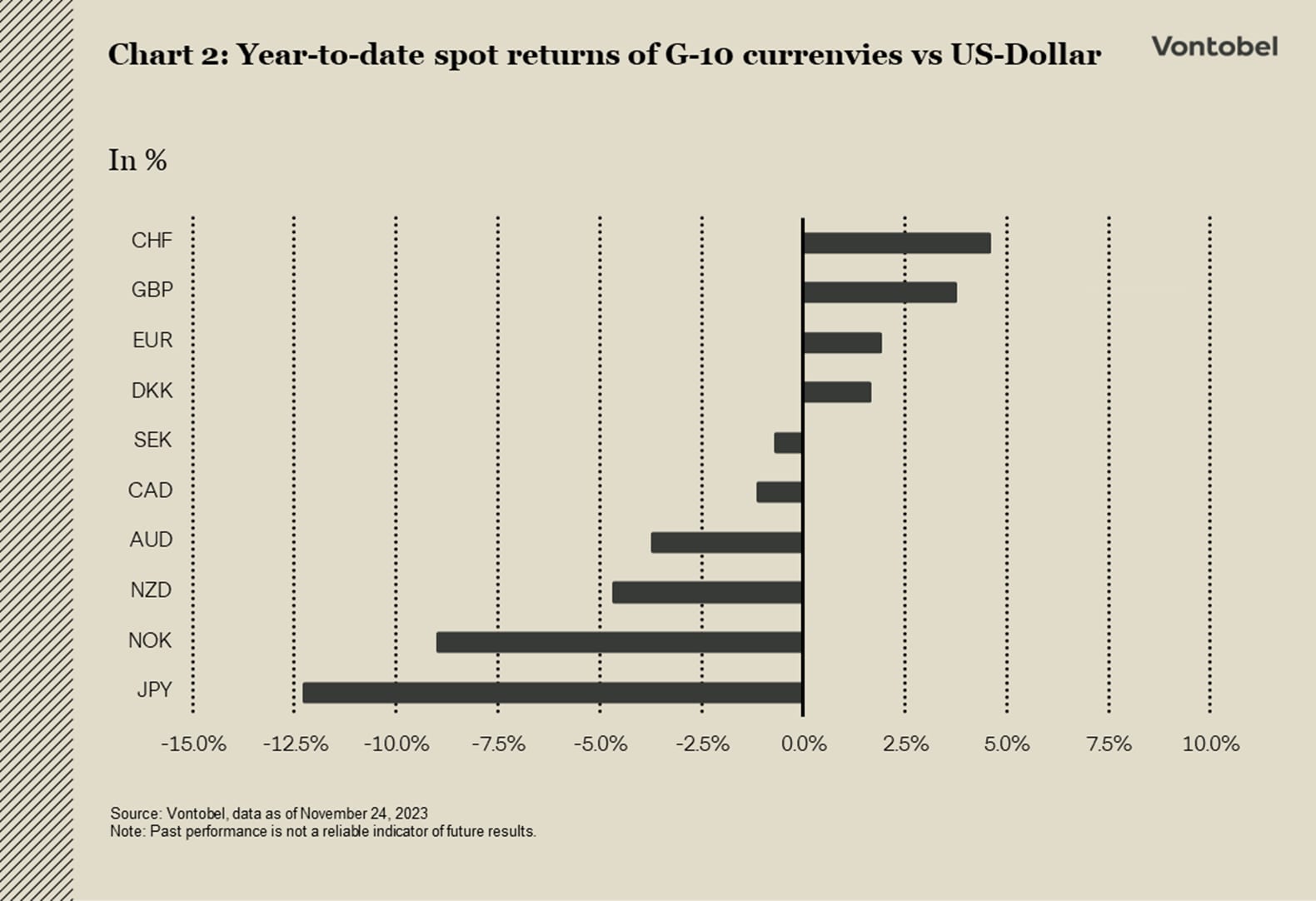 Sveitserfrancens egenskaper som trygg havn har fått økt oppmerksomhet i år, og sveitserfrancen skiller seg ut som den valutaen som har gjort det best blant G-10-valutaene, med en oppgang på rundt 4,5 prosent mot amerikanske dollar målt i spotavkastning (se diagram 2). Den sveitsiske nasjonalbanken (SNB) ser ut til å foretrekke å opprettholde en sterk valutakurs for å motvirke inflasjon fremfor å heve styringsrenten til over 1,75 prosent. Med et nytt SNB-møte planlagt til 14. desember, går markedsforventningene nå i retning av at det ikke blir flere rentehevinger, og at rentekuttene vil begynne neste år, med anslag som tyder på en første reduksjon i september.