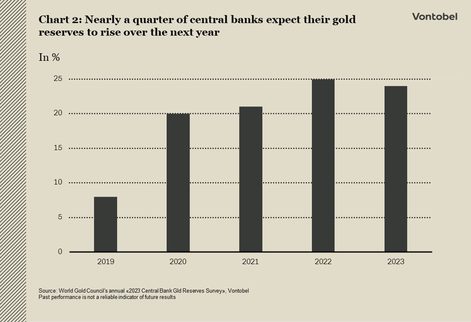 Etterspørselen ser også ut til å være solid på den fysiske siden. Sveits, som er et viktig knutepunkt for gullhandel, eksporterte mer enn 150 tonn gull i oktober, den største mengden siden mai. En betydelig andel av dette – rundt 49 tonn (+60 prosent sammenlignet med samme periode i fjor) – gikk til India. India er verdens nest største gullkonsument, og landet feirer en rekke festdager fra oktober til november, der gull er en populær gave. På lengre sikt kommer medvinden fra sentralbankene. Selv om de var nettoselgere i de tre tiårene etter Bretton Woods-systemets sammenbrudd, begynte de å bygge opp reservene sine igjen etter den globale finanskrisen. Denne trenden har forsterket seg de siste årene, særlig etter at vestlige land frøs Russlands sentralbankreserver. Ifølge World Gold Council forventer også rundt en fjerdedel av verdens sentralbanker å øke sine gullreserver det kommende året (se diagram 2).