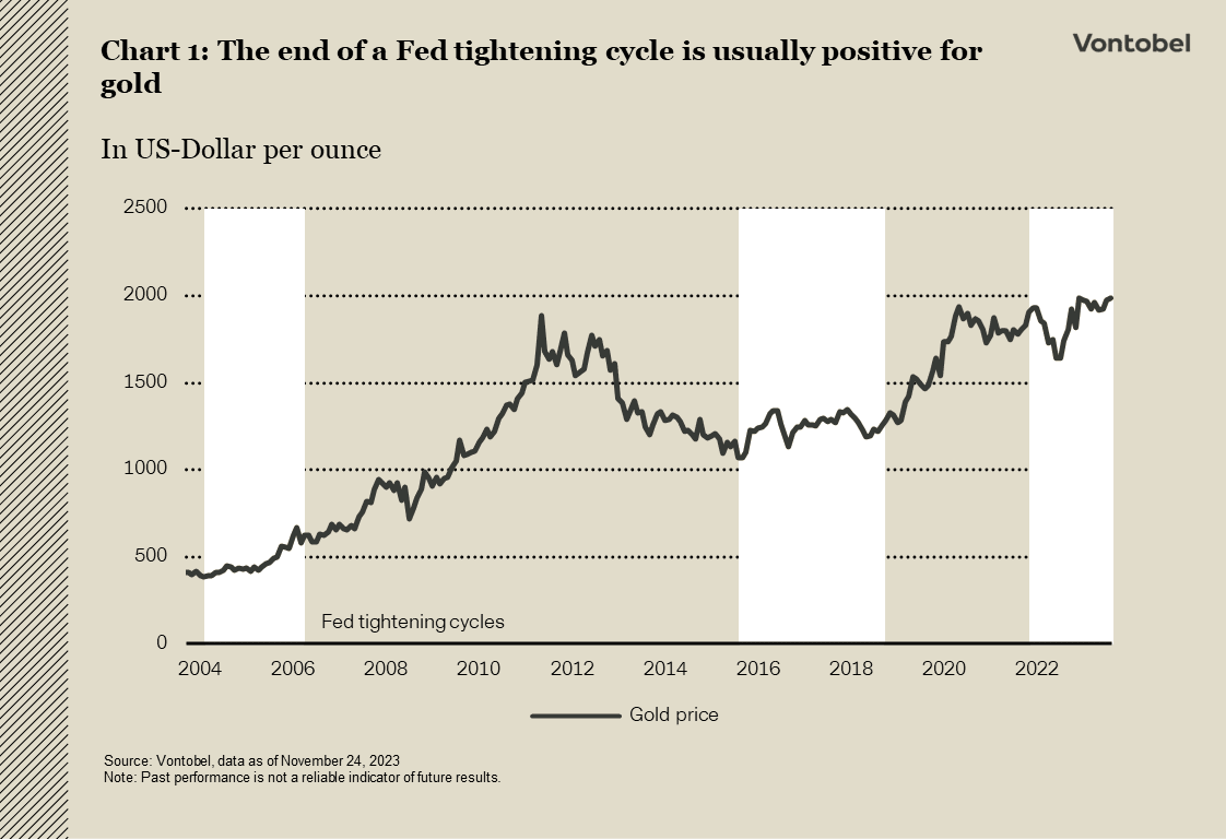 Gullet, derimot, lot seg ikke affisere av den synkende krigsrisikopremien: Det klarte å holde fast ved oppgangen fra oktober og flørtet til og med en stund med den psykologisk viktige grensen på 2000 dollar per unse i slutten av november. Det skyldes en rekke svakere økonomiske data enn forventet og avtagende inflasjon i verdens største økonomi, noe som fikk investorene til å prise inn et første rentekutt fra Fed i første halvdel av 2024. Slutten på Feds innstrammingssyklus og alt det innebærer, som fallende realrenter og en svakere amerikansk dollar, har ofte vært en positiv katalysator for gull tidligere (se diagram 1).