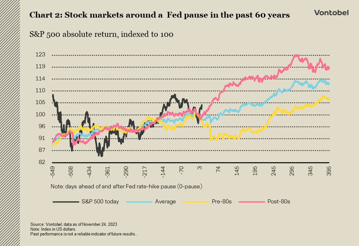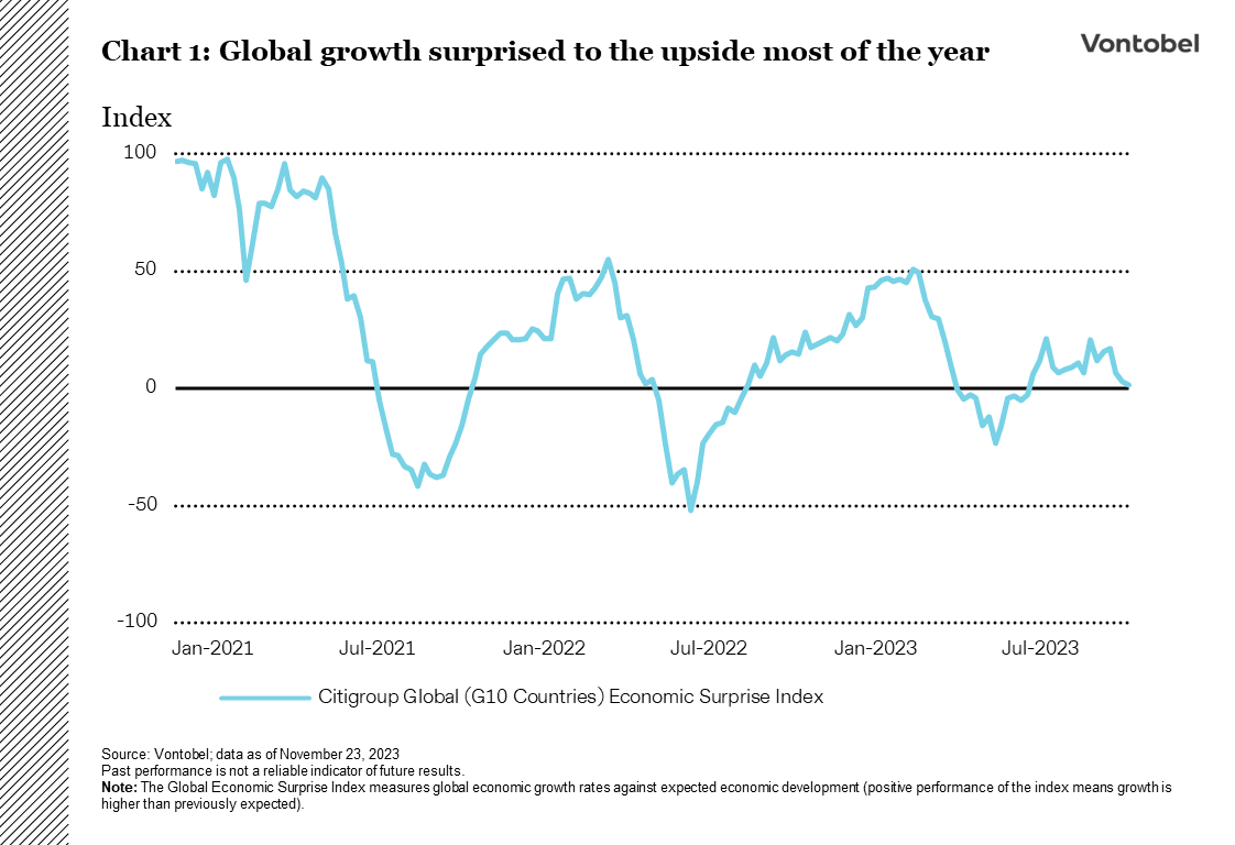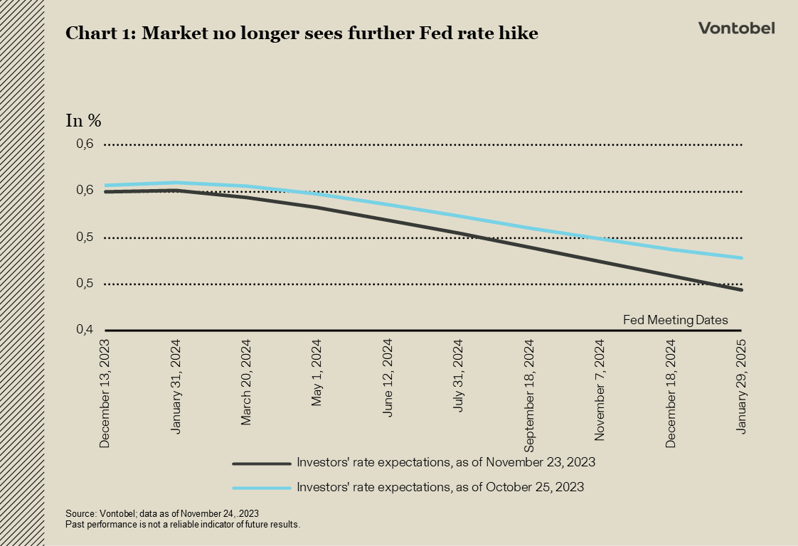Sentralbankene brukte november til å understreke behovet for å holde pengepolitikken restriktiv lenge nok. Makroøkonomiske data som viste tegn til svekkelse i det amerikanske arbeids- og boligmarkedet, fikk imidlertid investorene til å stille spørsmål ved hvor lenge "lenge nok" egentlig vil være. Flere tegn på en svekket amerikansk økonomi vil sannsynligvis komme, fordi de aggressive renteøkningene ennå ikke har har full effekt, og derfor gjentar Vontobel Multi Asset Boutique sin forventning om at USA til slutt vil gå inn i en resesjon i første halvdel av 2024.