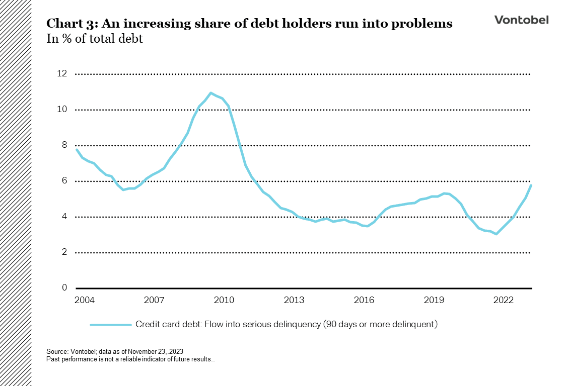 Forbrukerne har trivdes med å bruke penger, noe som har satt fart på økonomien lenge etter at pandemisperringene ble opphevet. Hva om forbrukerne ikke er klare til å stramme inn pengebruken ennå? I øyeblikket bruker de mer enn de tjener, noe som betyr at sparepengene deres minker eller at de opparbeider seg ny gjeld. Faktisk nådde den amerikanske kredittkortgjelden nylig et rekordhøyt nivå på over 1000 milliarder dollar. Samtidig har renter på over 20 prosent ført til en økning i antall betalingsanmerkninger (se diagram 3). Det virker lite sannsynlig at amerikanske forbrukere vil kunne redde verdensøkonomien fra en resesjon så mye lenger.