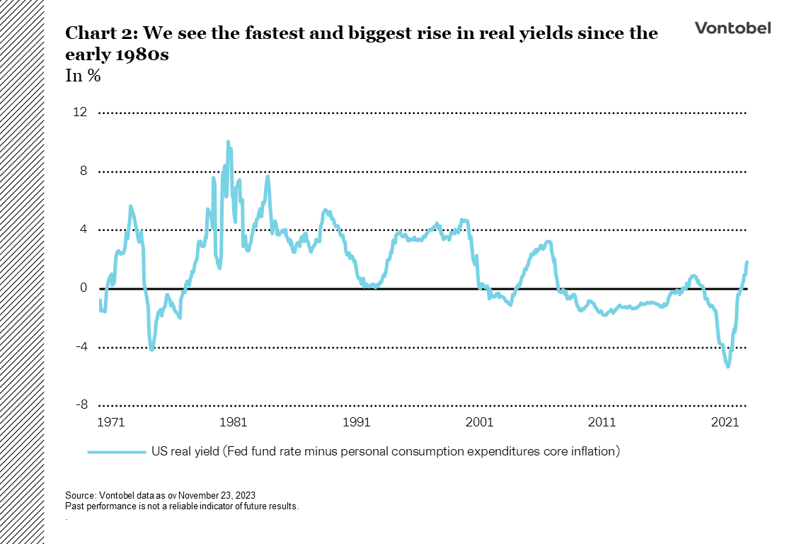 Resesjonsdebatten – blir det resesjon eller ikke? Det viktigste spørsmålet for investorene i 2024 er om det vil være mulig å bekjempe inflasjonen uten å utløse en resesjon. Dette er noe man aldri tidligere har klart. Høyere renter har sin pris og viser allerede de første sprekkene i økonomien, bare tenk på bankkrisen i fjor vår. Jo lenger rentenivået holder seg høyt, desto større blir konsekvensene - noe man bør ha i bakhodet når man ser på den kraftigste økningen i realrentene siden starten av 1980-tallet (se diagram 2). De inflasjonsjusterte rentene har nådd sitt høyeste nivå på 15 år, men i motsetning til den gang har verden nå betydelig mer gjeld.