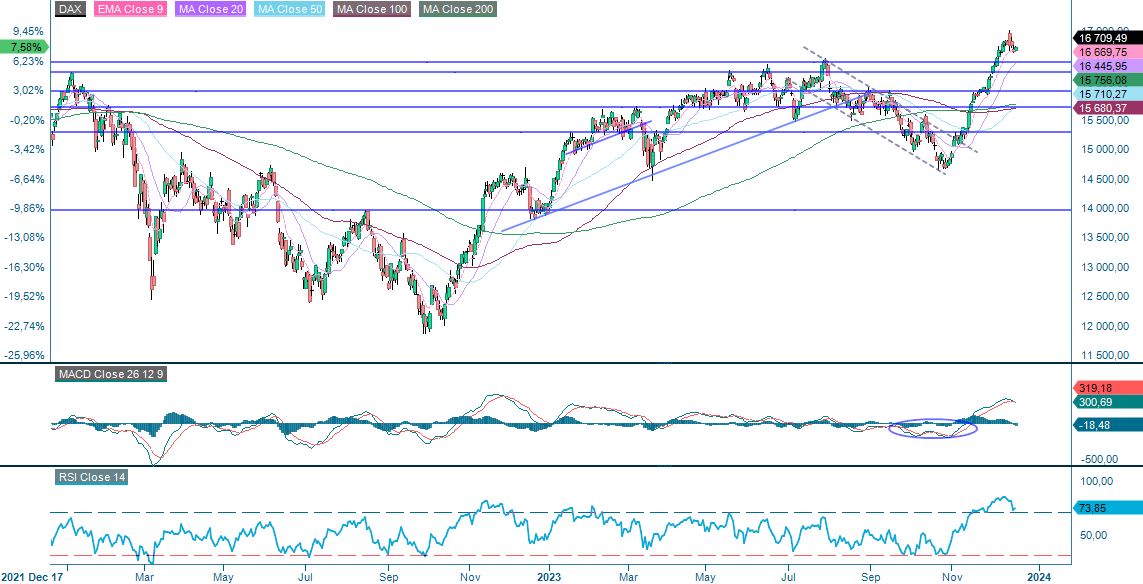På den annen side mister DAX momentum, noe som illustreres av et svakt salgssignal i MACD. Det er på nivåer som overgår de som ble nådd i 2022. Kanskje lang OMXS30 og kort DAX kan være en enda mer attraktiv spread? Det er også vanskelig å se bort fra den skummelt utseende dojien i ukediagrammet som ble generert i forrige uke.