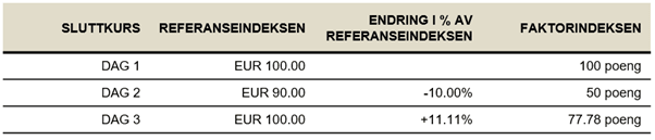 - Dermed vil faktorindeksen ha et tap på 22,2 prosent, selv om den underliggende referanseprisen til referanseindeksen vil bli handlet på det opprinnelige nivået.
